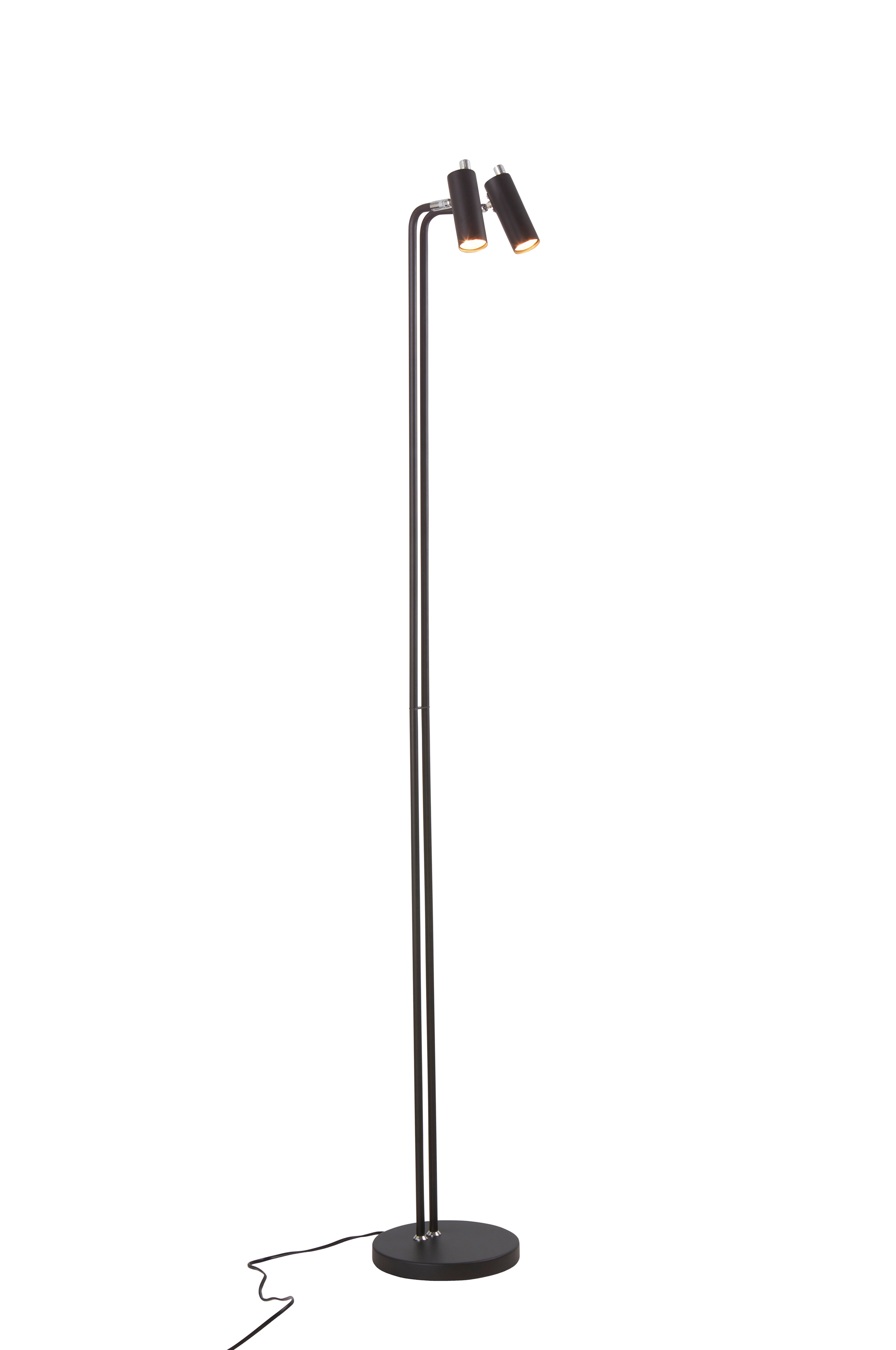 Gulvlampe i metal inklusive LED-belysning. 2 justerbare lampehoveder med dæmper/strømafbryder på lampehovedet. Ensfarvet yderside og detaljer i krom. Transparent ledning i plast, 170 cm.
