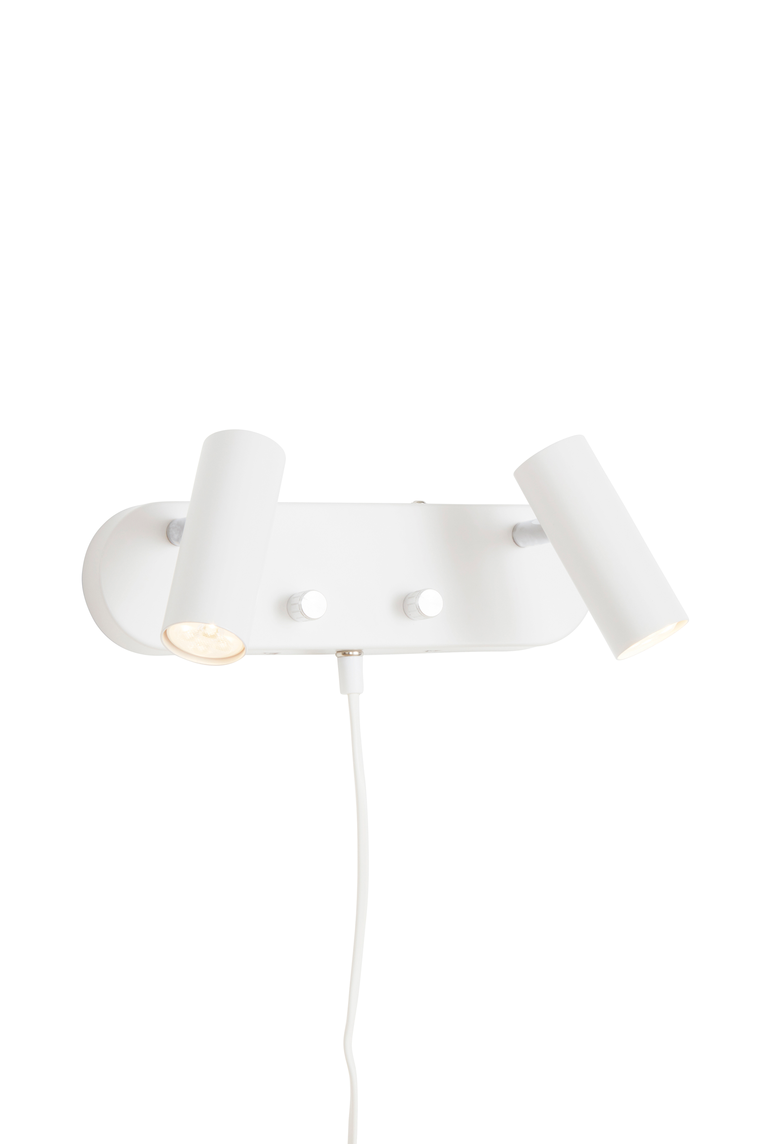 Væglampe i metal inklusive LED-belysning. 2 justerbare lampehoveder med dæmper/strømafbryder på vægpladen. Ensfarvet yderside og detaljer i krom. Transparent ledning i plast, 170 cm.
