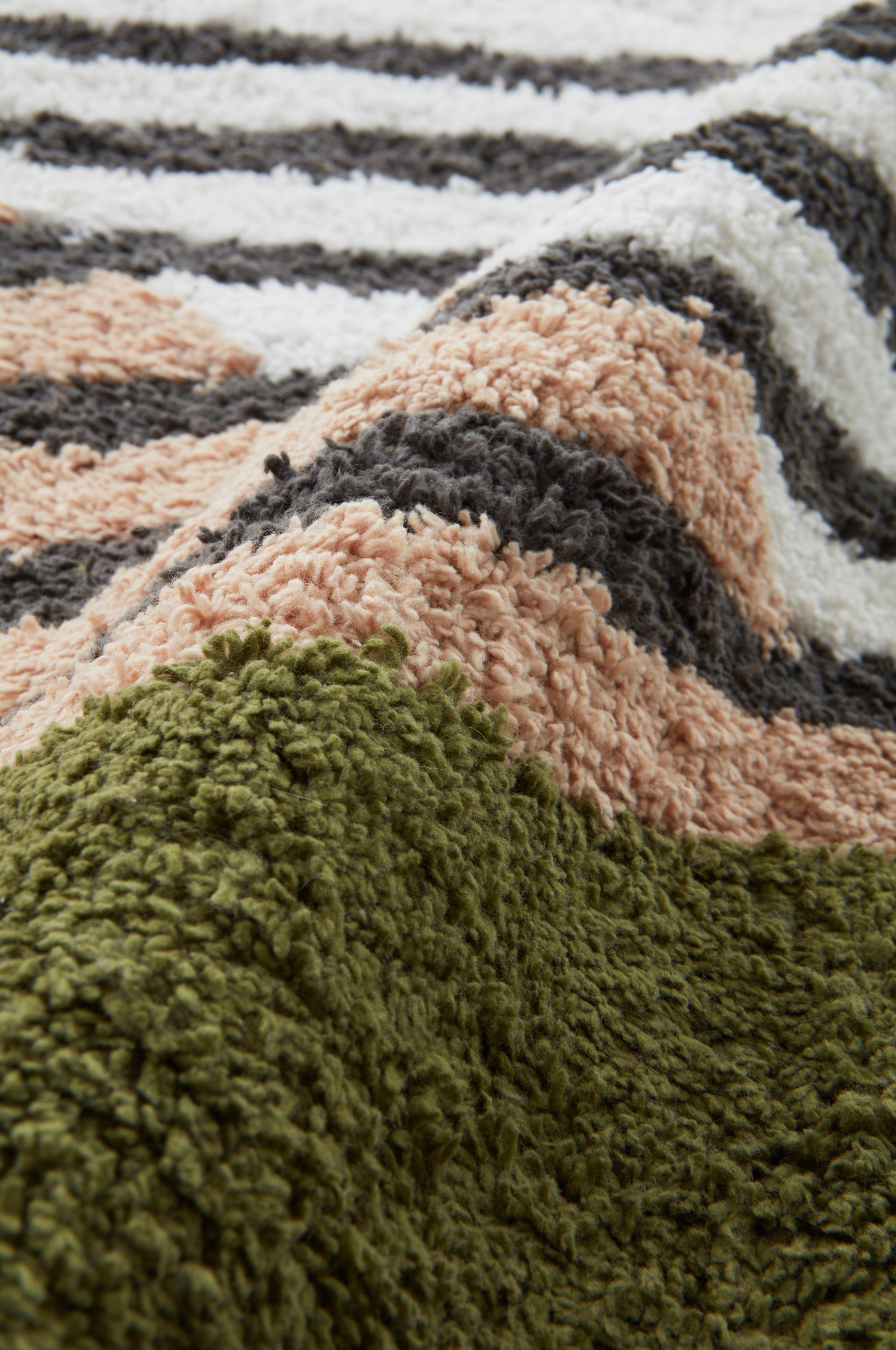LUNA er et bomuldstæppe med speciel form, hvor den ene ende er kantet og den anden afrundet. Det geometriske mønster er fint uregelmæssigt og garnfarvet. Tæppet er blødt og behageligt med sin korte, tætte bomuldsluv. Luvhøjde 1 cm. Tykkelse 1,1 cm. 1400 g/m².