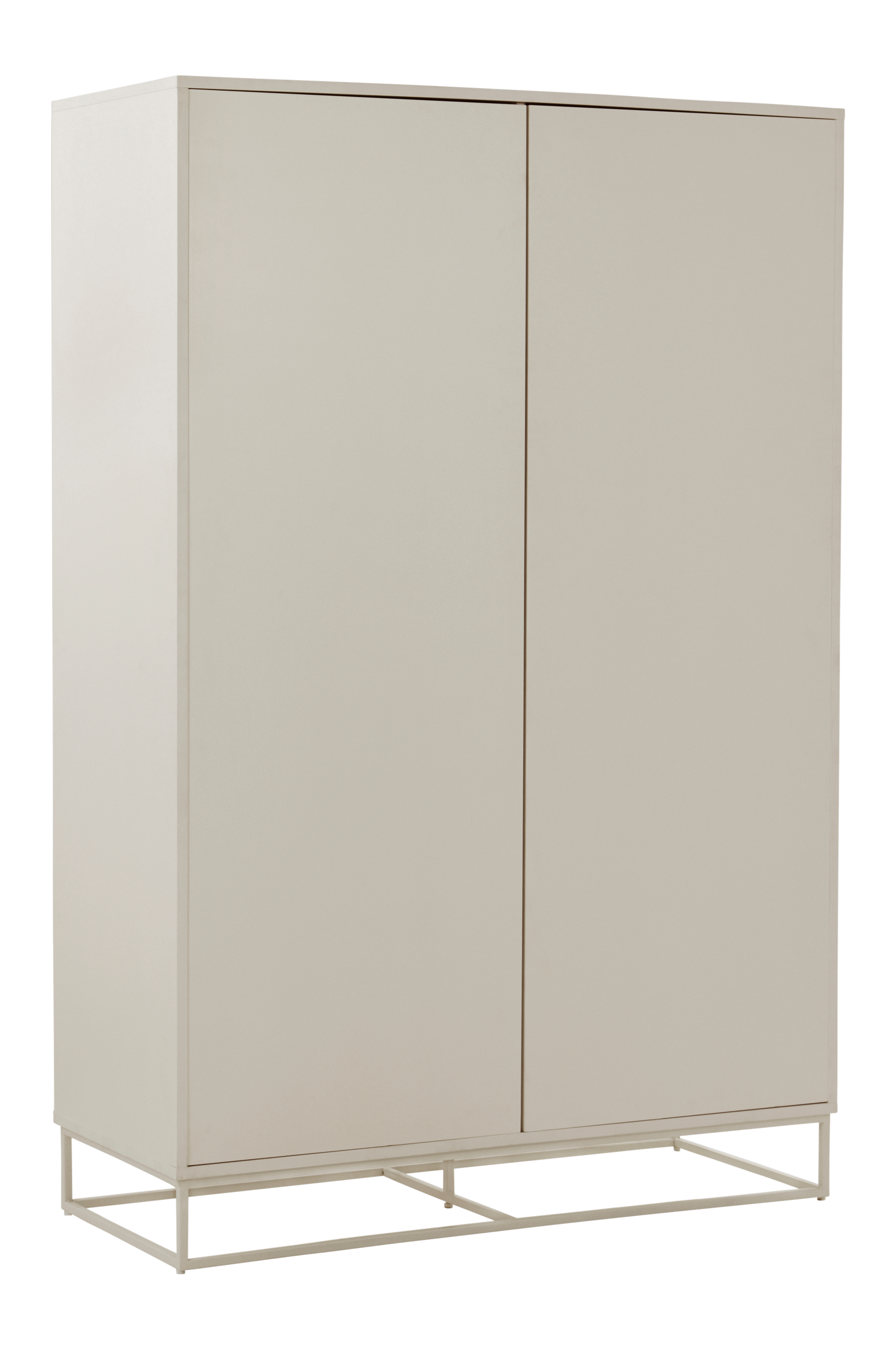 Garderobeskab af MDF med understel af metal. Det enkle og stilrene skab har to låger med pushfunktion. Det gør at skabet er helt glat uden håndtag og også er let at åbne. Garderoben er todelt. Den venstre del har bøjlestang af massiv bøg og en fast hylde. Den højre del har tre flytbare hylder. Delene af MDF har vandbaseret lak. Understellet er af kvadratisk profil med pulverlakering. Vægmontering gør det muligt at fastgøre skabet til væggen, hvis det er nødvendigt. Skal færdigsamles. Samlevejledning medfølger.