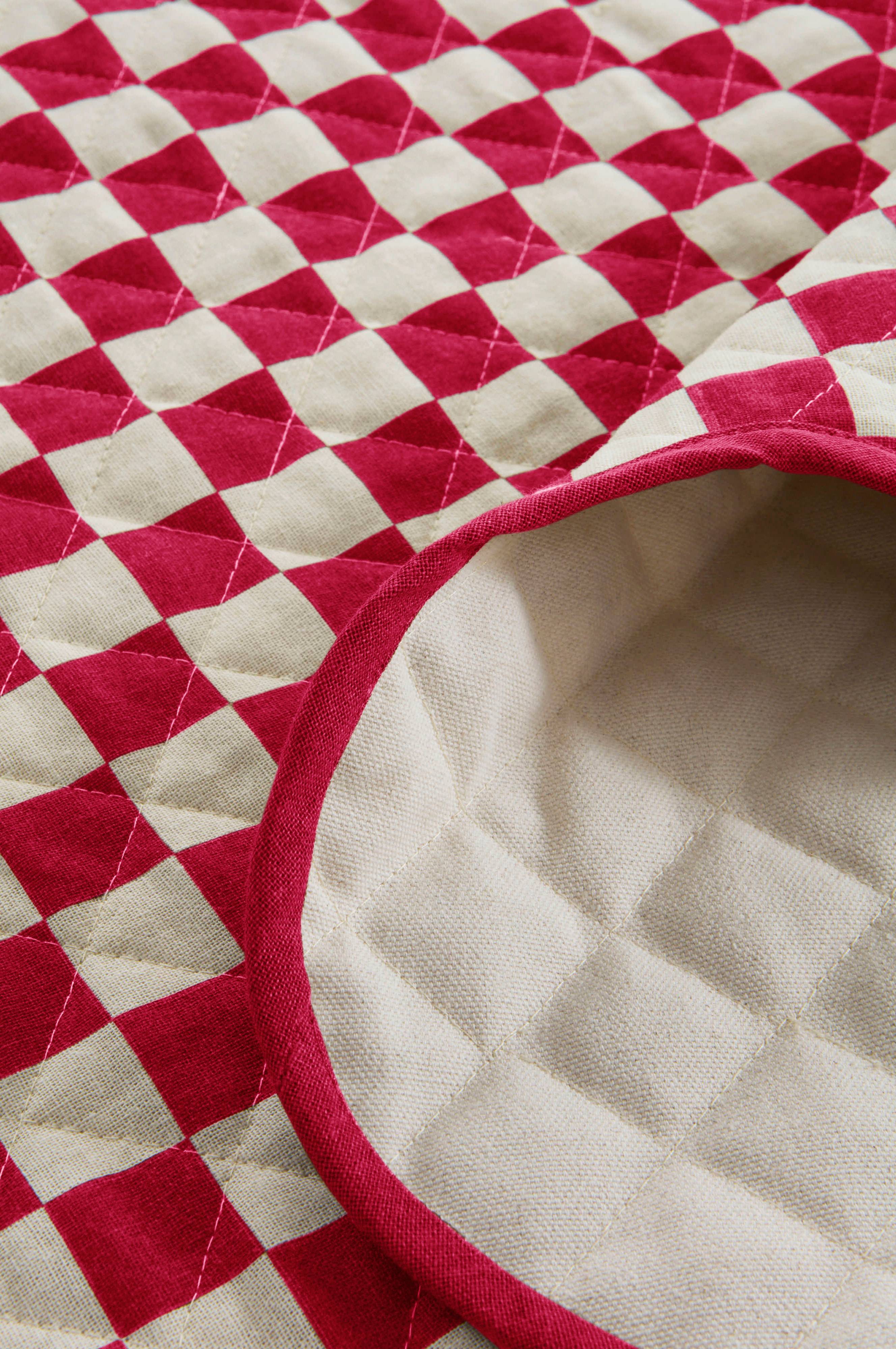 Tæppet LYRA har en charmerende blomsterlignende form. Det er lavet af bomuld med lærredsbagside og er ideelt til at lægge under juletræet. Det er quiltet med et printet kvadratisk mønster og kan vendes, så du får en alsidig stil.