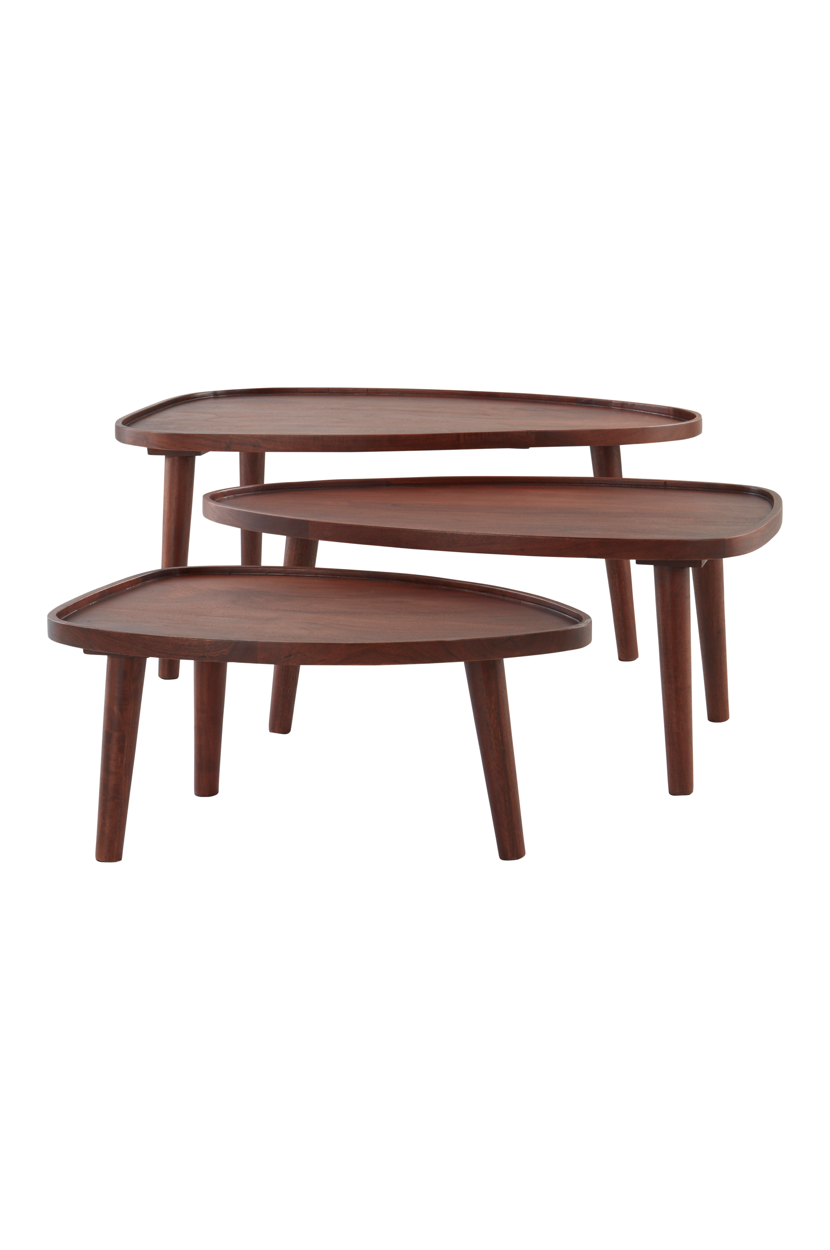 Tre flot formede sofaborde af mangotræ med en smuk overfladebehandling, der giver træet en varm glans samtidig med, at årerne bevares. De tre borde fungerer som et klassisk indskudsbord, hvor du kan skubbe bordene ind under hinanden. Bordpladerne har strygejernsform med runde hjørner.