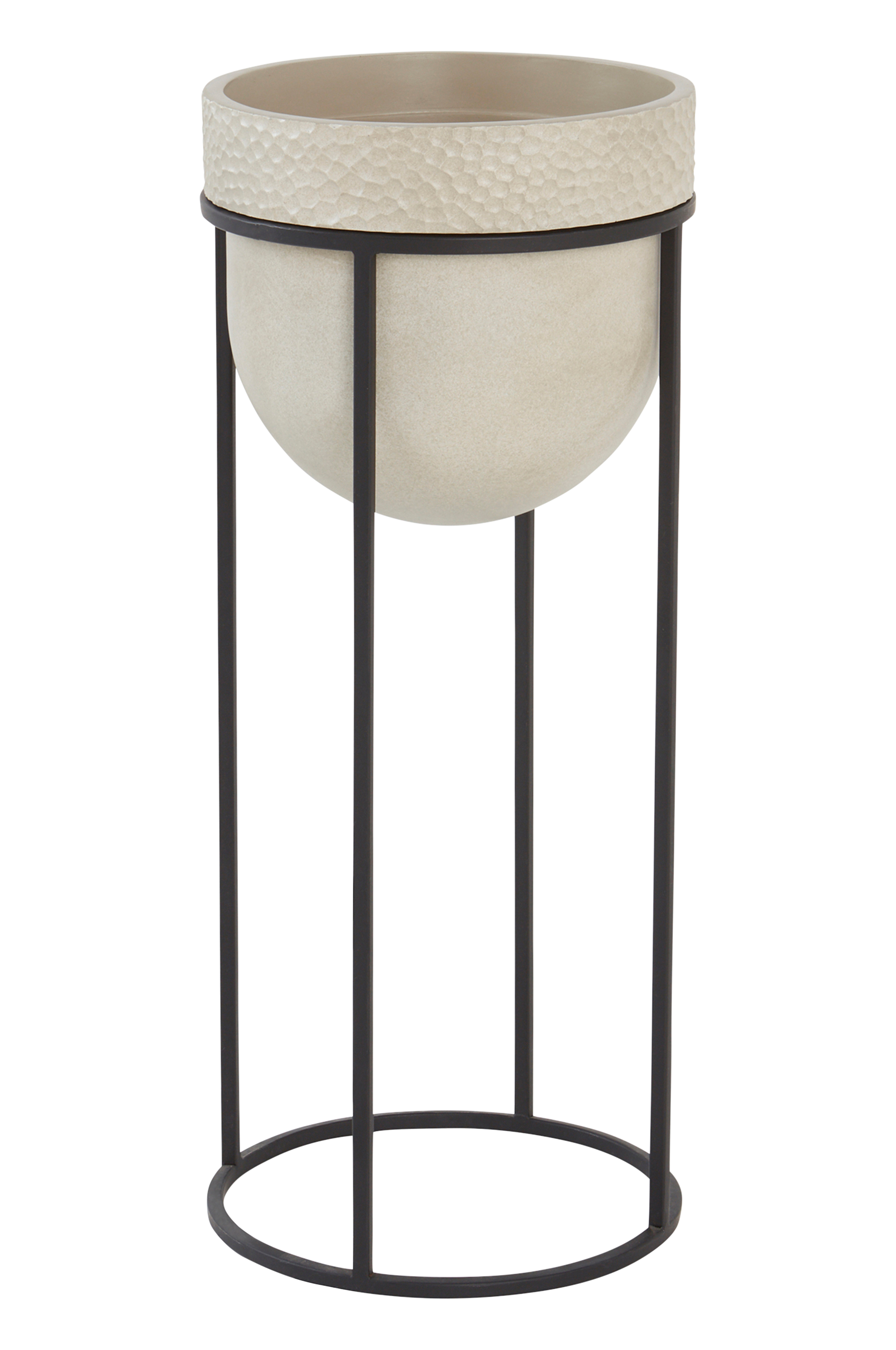 Smukt formet krukke af polyresin på metalstativ. Krukken har et fint look og blank glasur.