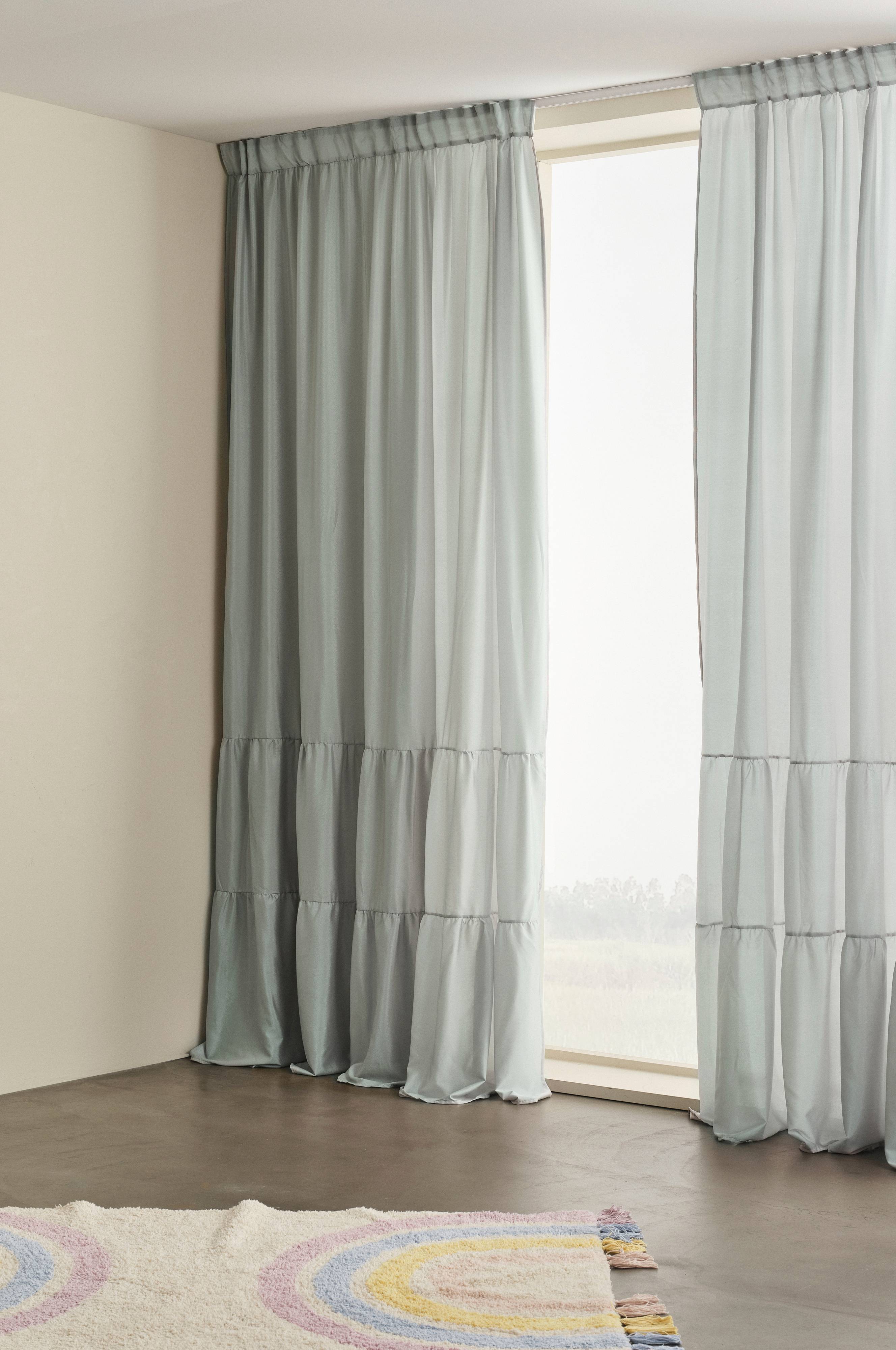 Meget flotte gardiner med flot etui, behagelig grøn farve og flæser, passer meget godt i børneværelser!