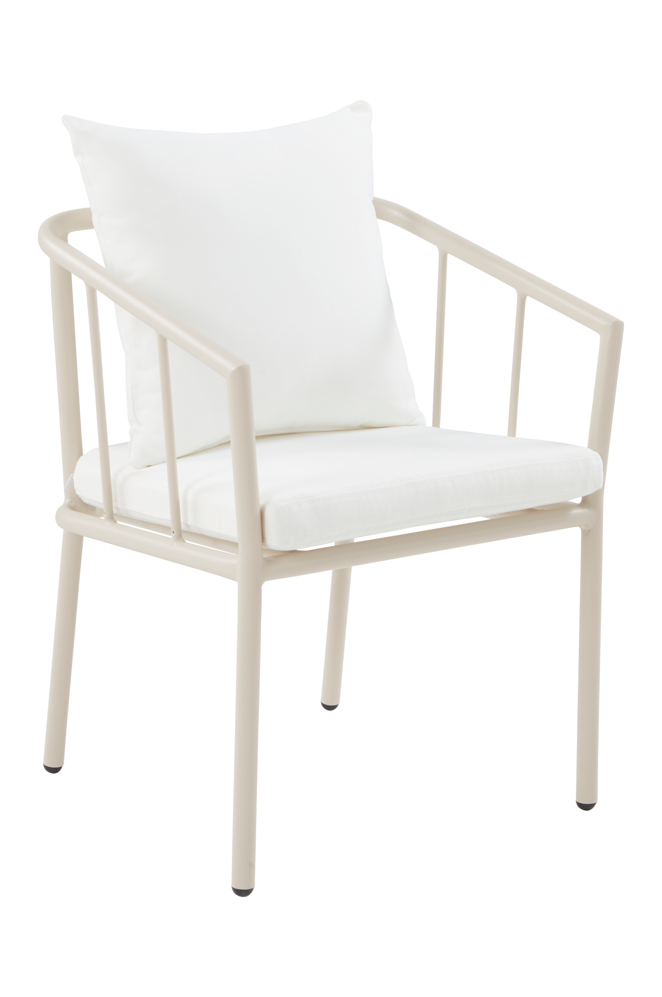 Det er dejligt at flytte ud på altanen eller i haven, når sommeren er her. MENTON kan stå udendørs, hvilket gør udelivet lettere. Du behøver ikke at bære den, hver gang du vil sidde udenfor. Stolen med armlæn er pæn og behagelig at sidde i. Sædehynde og pude medfølger. Lav vægt. MENTON er nem at stable til opbevaring.