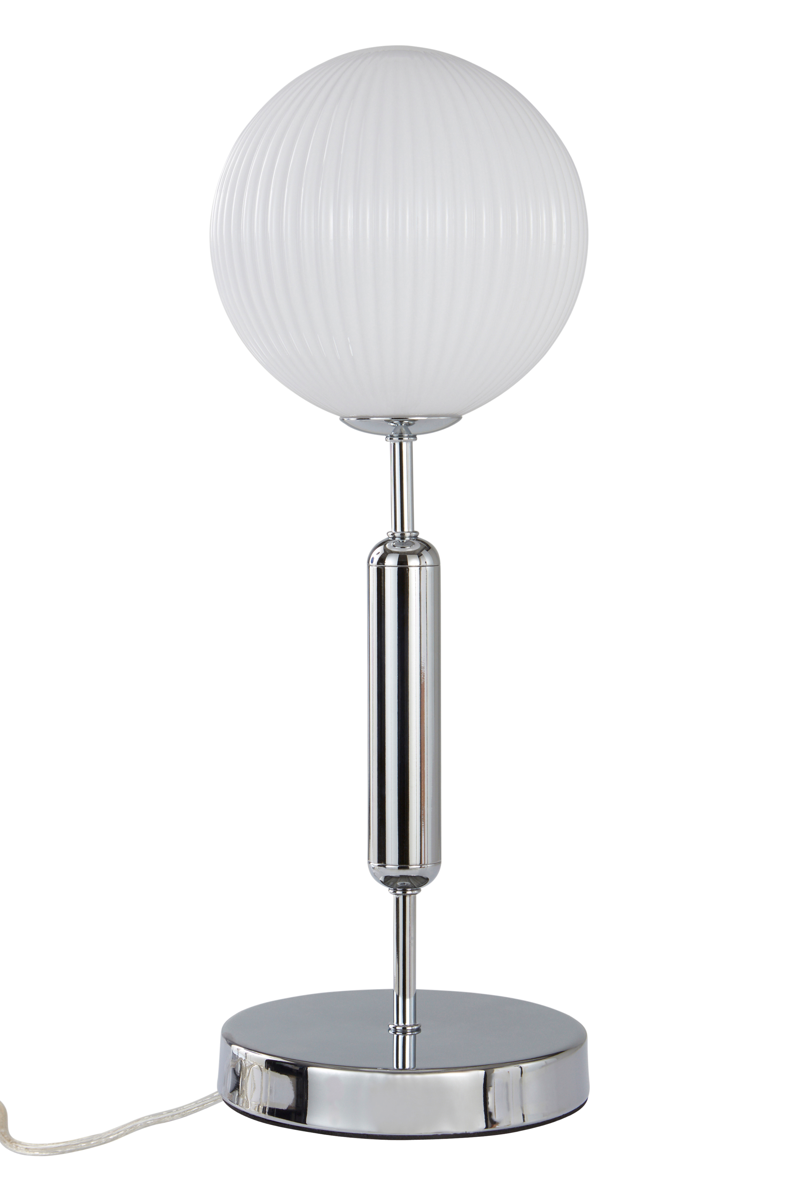 Bordlampe med fod af forkromet jern og rund glaskuppel med strukturstriber i glasset, som giver et flot skær. Strømafbryderen sidder på den transparente ledning. Stikket er Europa-model, det vil sige fladt med tyndere stikben (4 mm).