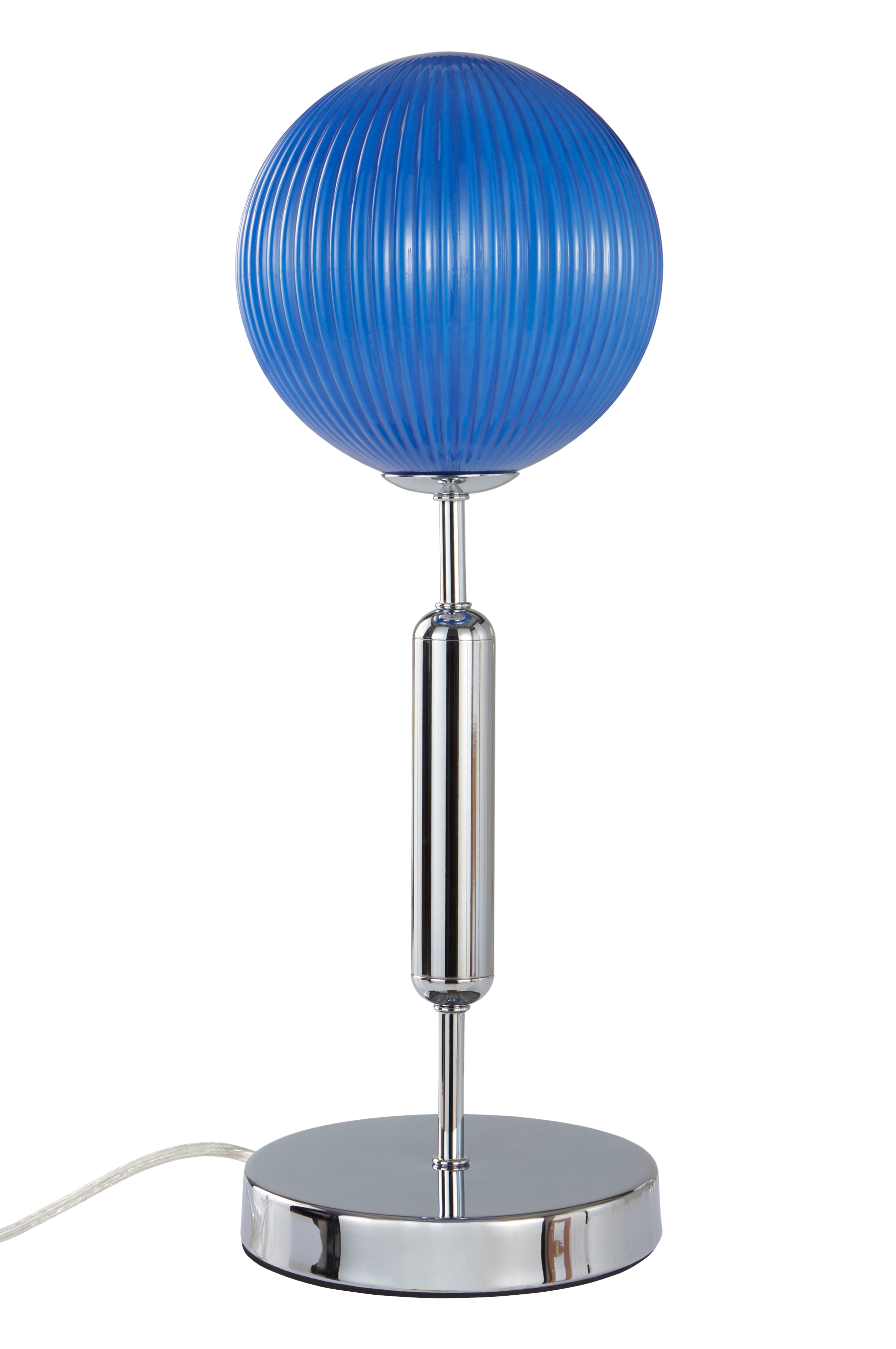 Bordlampe med fod af forkromet jern og rund glaskuppel med strukturstriber i glasset, som giver et flot skær. Strømafbryderen sidder på den transparente ledning. Stikket er Europa-model, det vil sige fladt med tyndere stikben (4 mm).