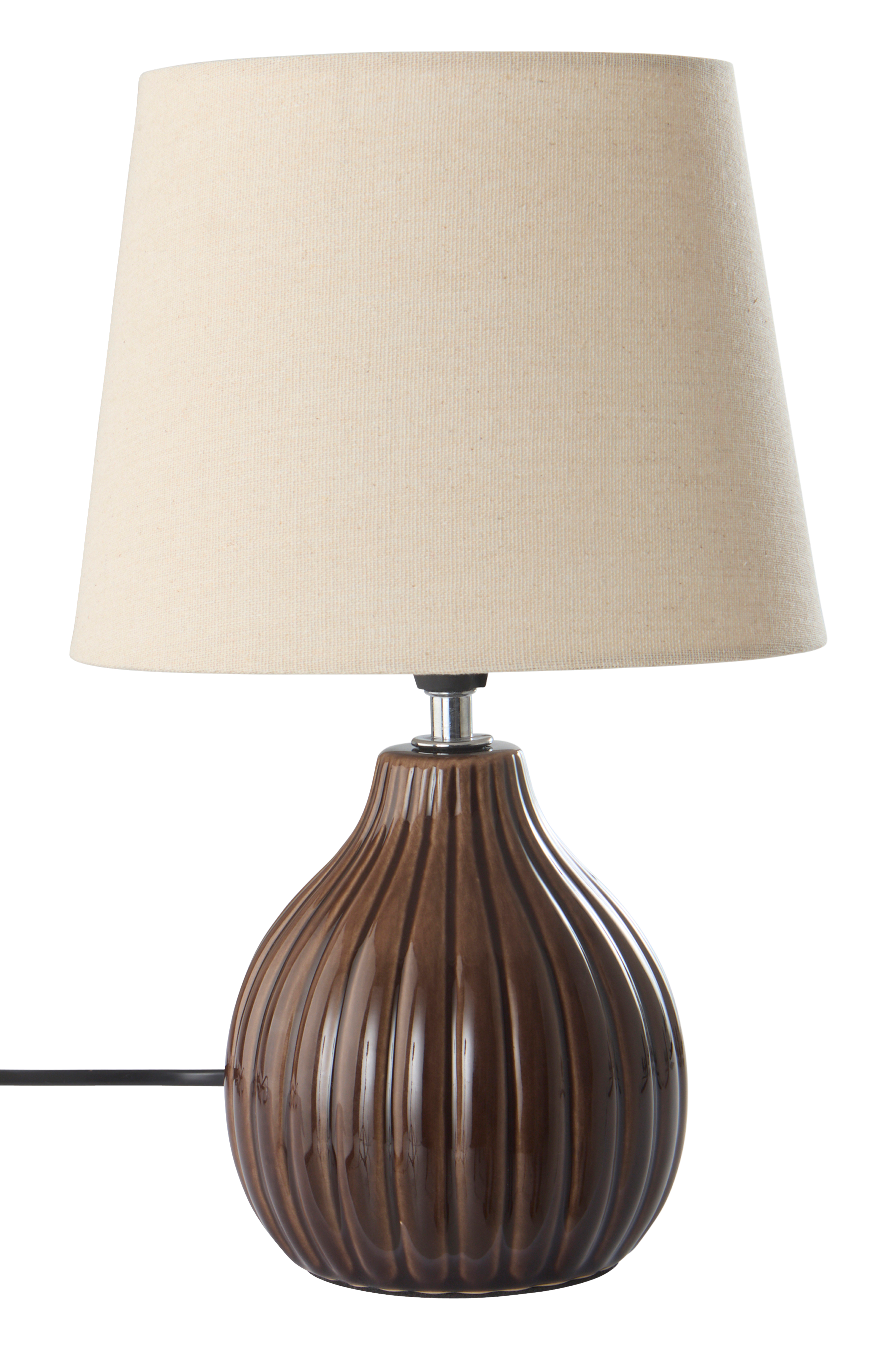 Bordlampe med fod af keramik og skærm i hør. Foden er blødt afrundet med lodret reliefstriber og smuk glasur. Den glatte hørskærm giver et stilrent udtryk. Skærmen har metalstel.
