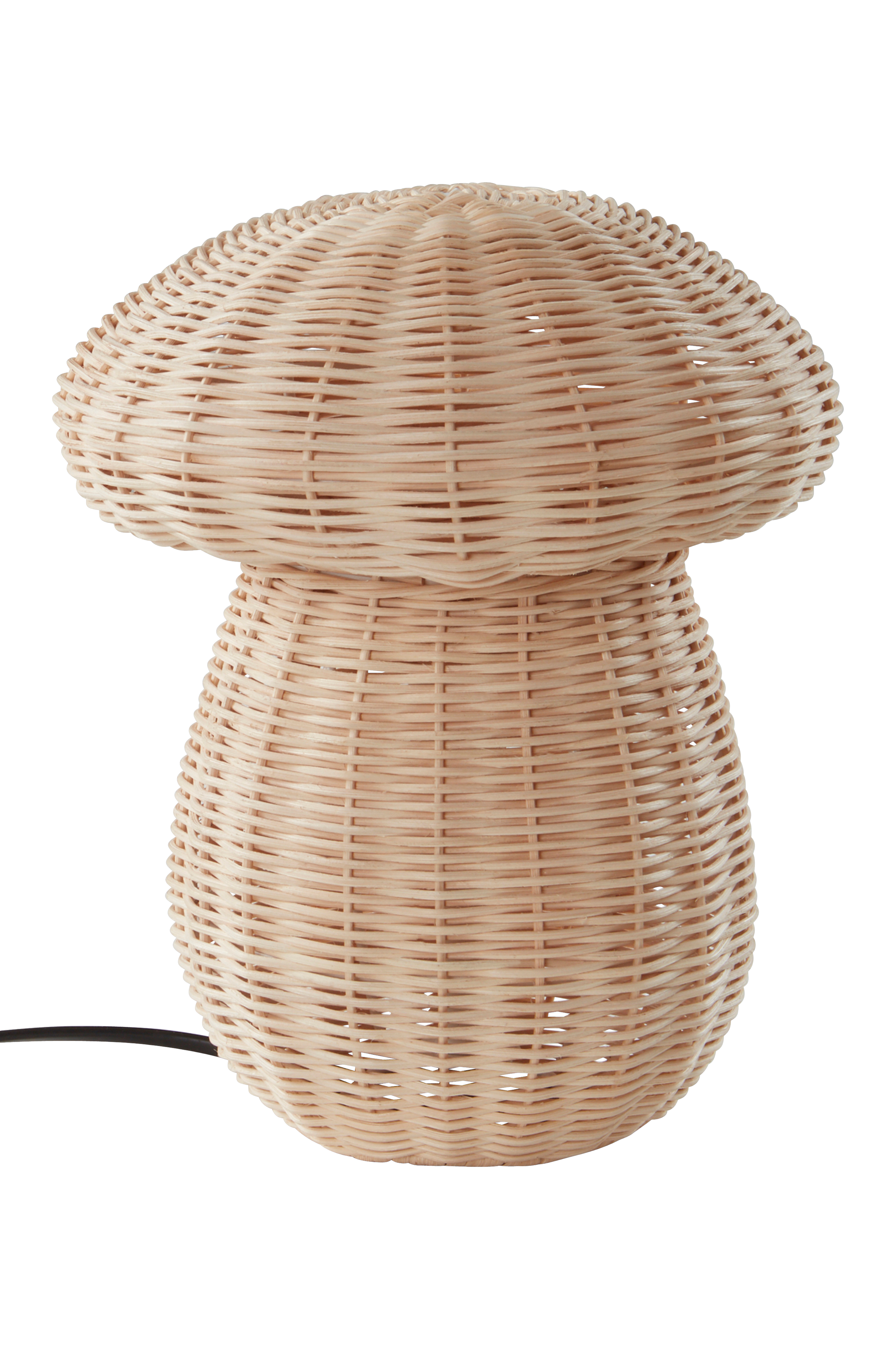 Bordlampe af naturlig rotting med stel af metal. MUSH er formet som en svamp og den flettede rotting giver et hyggeligt og varmt skær. Sort ledning. Lampen er ujordet, klasse 2.