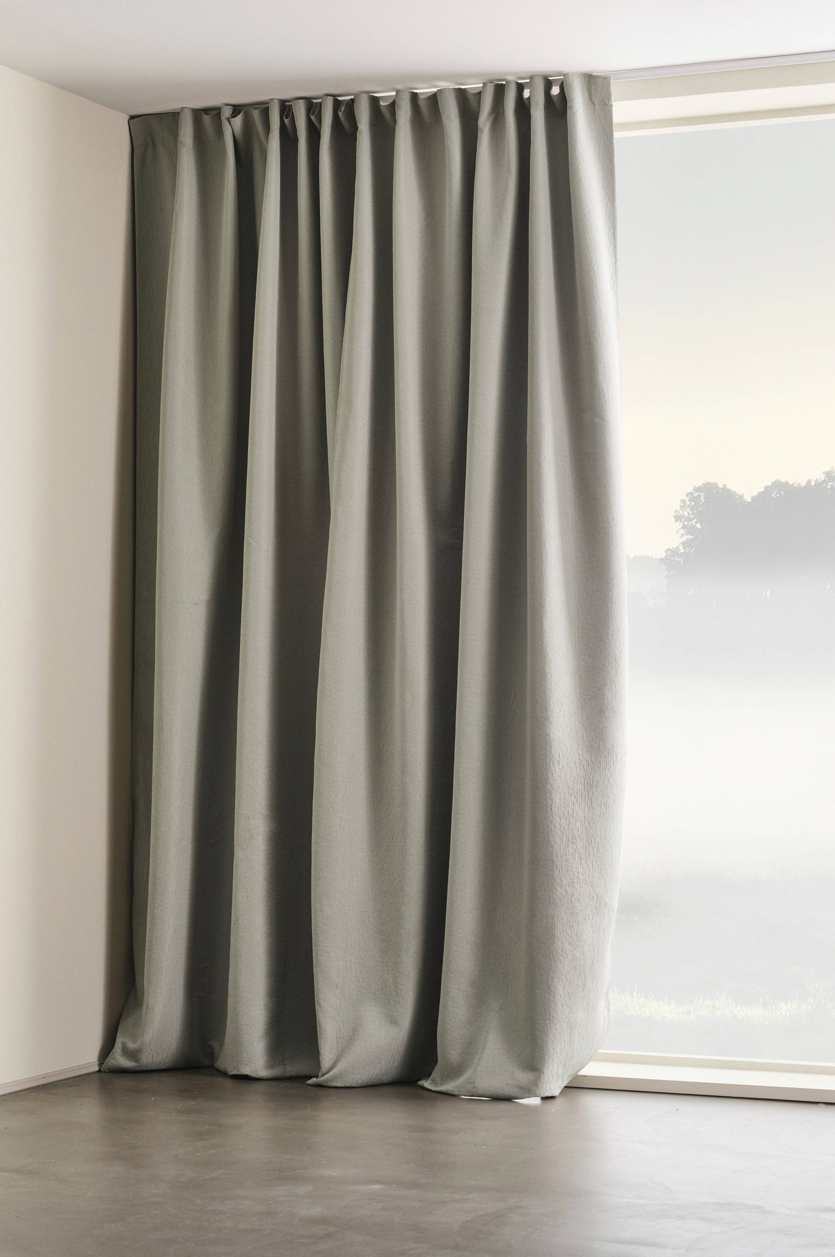 Det ekstra brede og fuldstændigt uigennemsigtige tunge stof skaber en hotelagtig stemning i rummet. Smuk mønstring på overfladen, giver også en holdbar satinfinish på bagsiden.