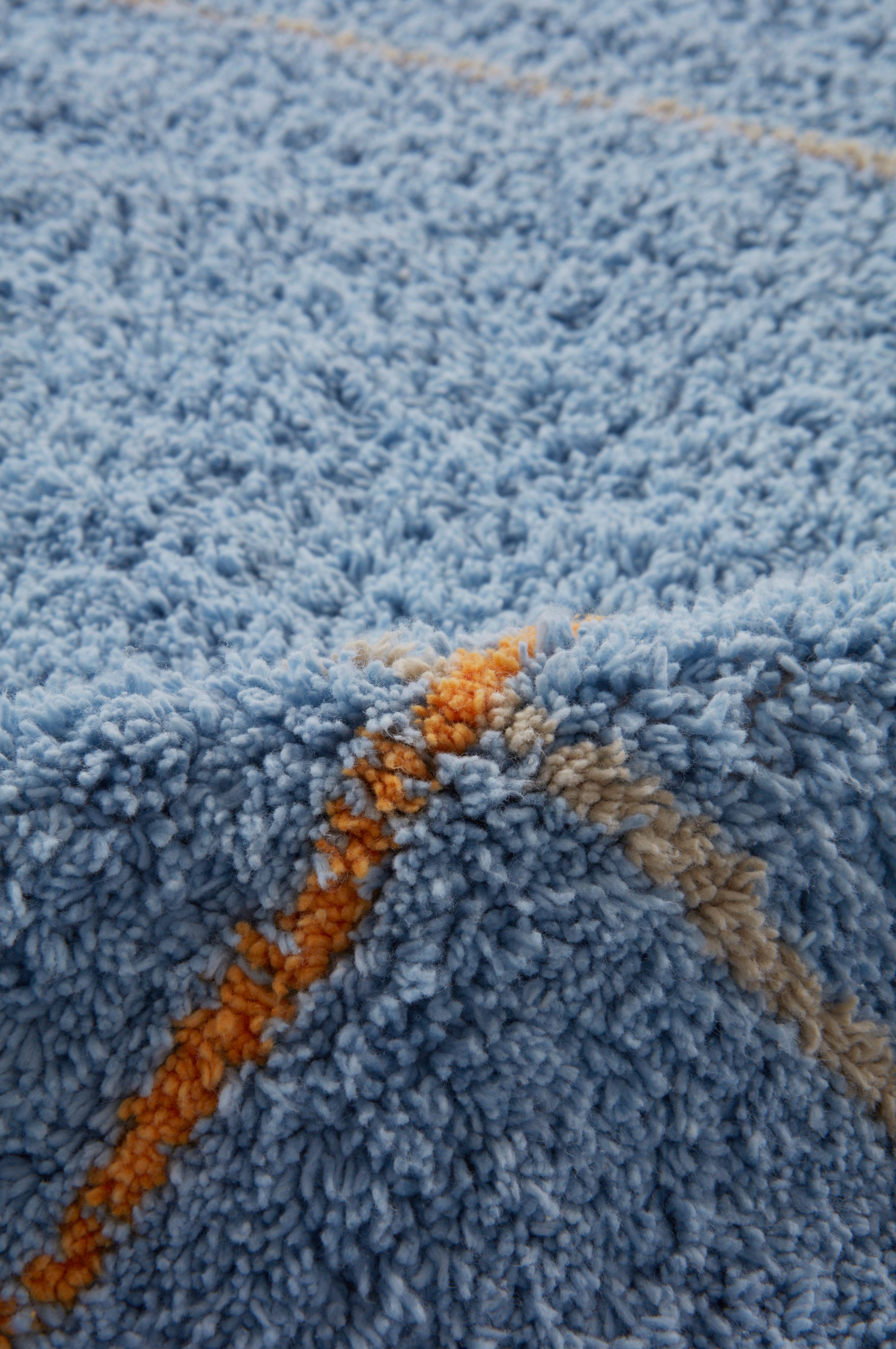 Mønstret tæppe af bomuld med kort, blød luv. Ternene er skabt med tynde linjer i luven, én farve vandret og en anden farve lodret. Et blødt og skønt bomuldstæppe passer godt både i dagligstuen og i soveværelset. Luvhøjde 1 cm. Tykkelse 1,1 cm. 1415 g/m².