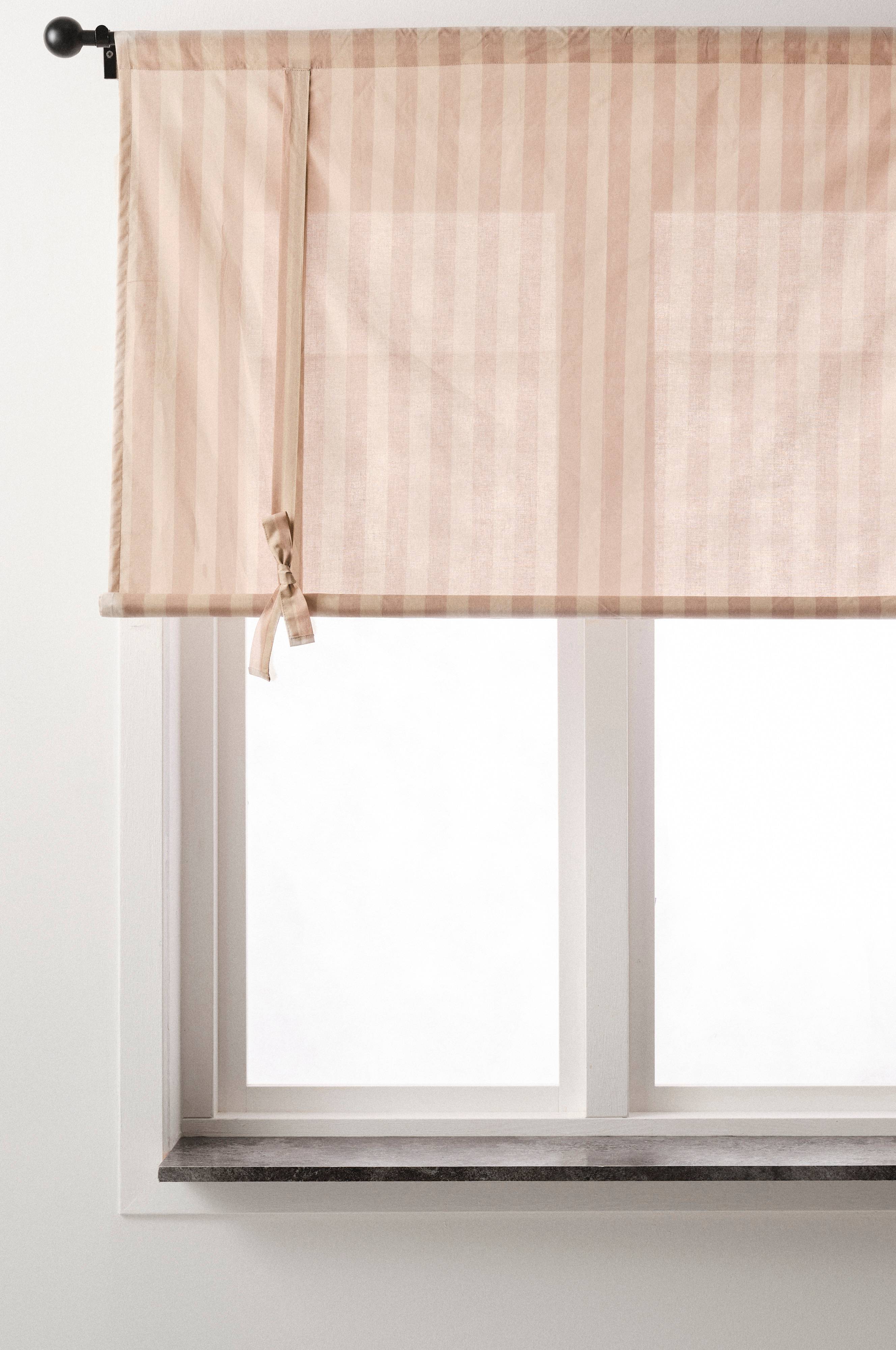 Roll up-gardin i bomuld med printede striber. Stribet er klassiskt og altid moderne, et mønster som er let at matche med andre mønstre. Roll up-gardinet justeres nemt efter dine ønsker om indsyn. Hænges på almindelig gardinstang. Højden reguleres med bindebånd.