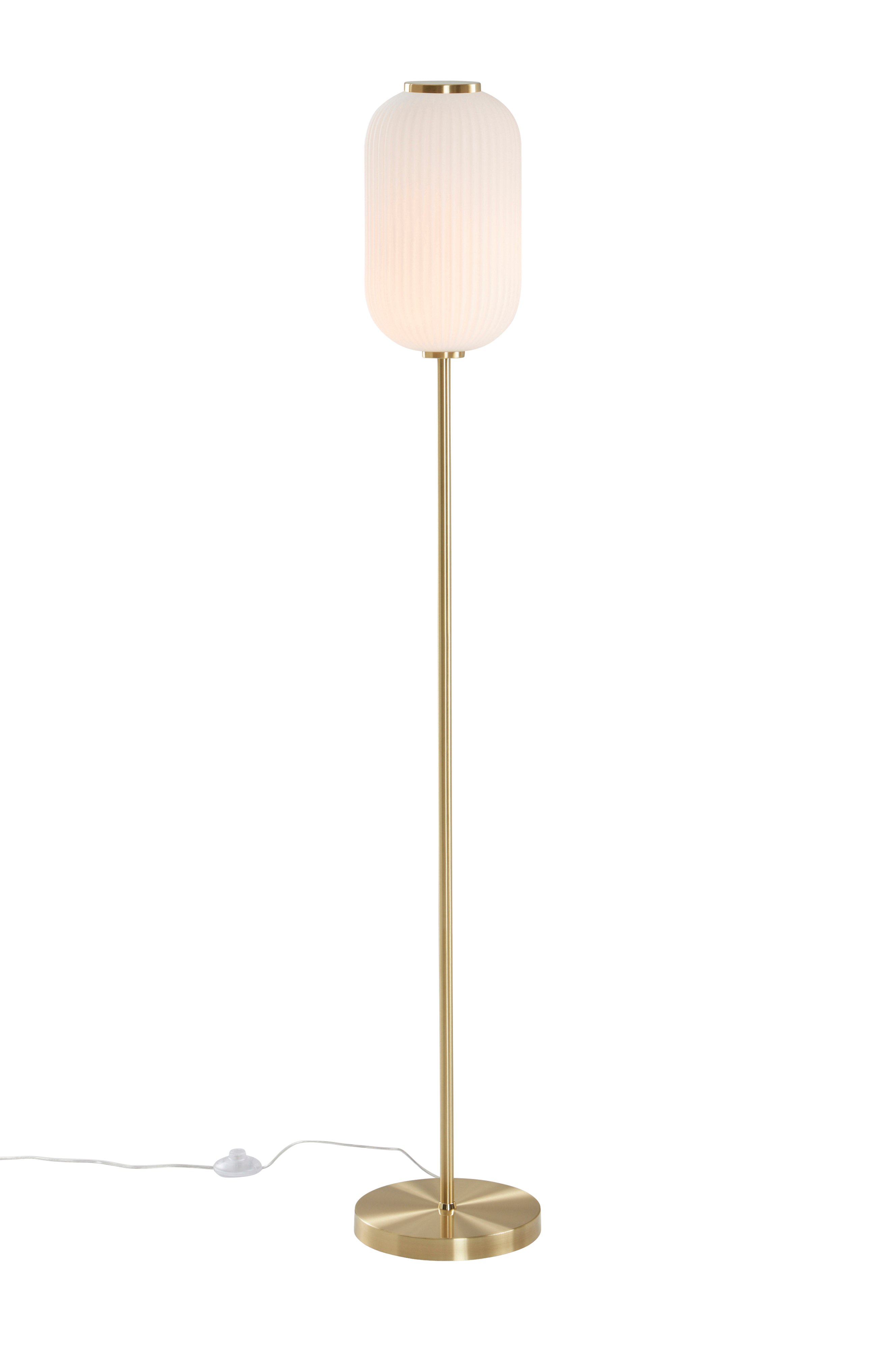 Gulvlampe med fod i børstet messing og kuppel i hvidt glas med bølgeformet struktur. Bordlampen har et klassisk og tidløst look og er meget nem at placere. Transparent ledning, ledningslængde 1,7 m.