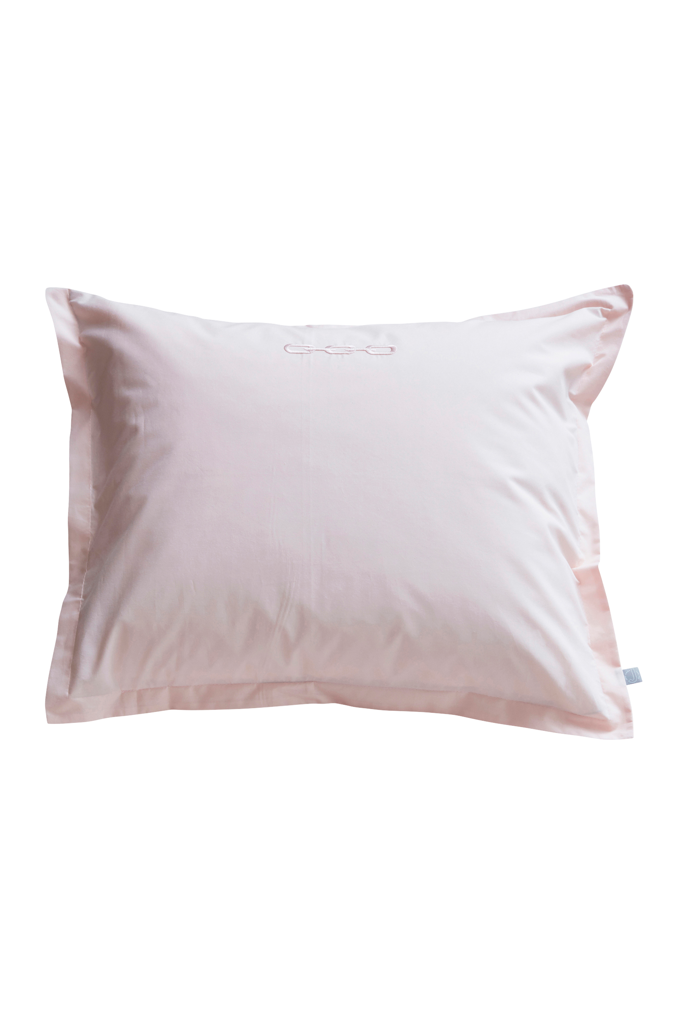 Pudebetræk i ensfarvet bomuldspercale med broderet mønster. Trådtæthed på 200 tc. (Trådtætheden angiver antal tråde, Thread Count, pr. kvadrattomme i et stof. Jo højere trådtæthed, jo højere kvalitet).