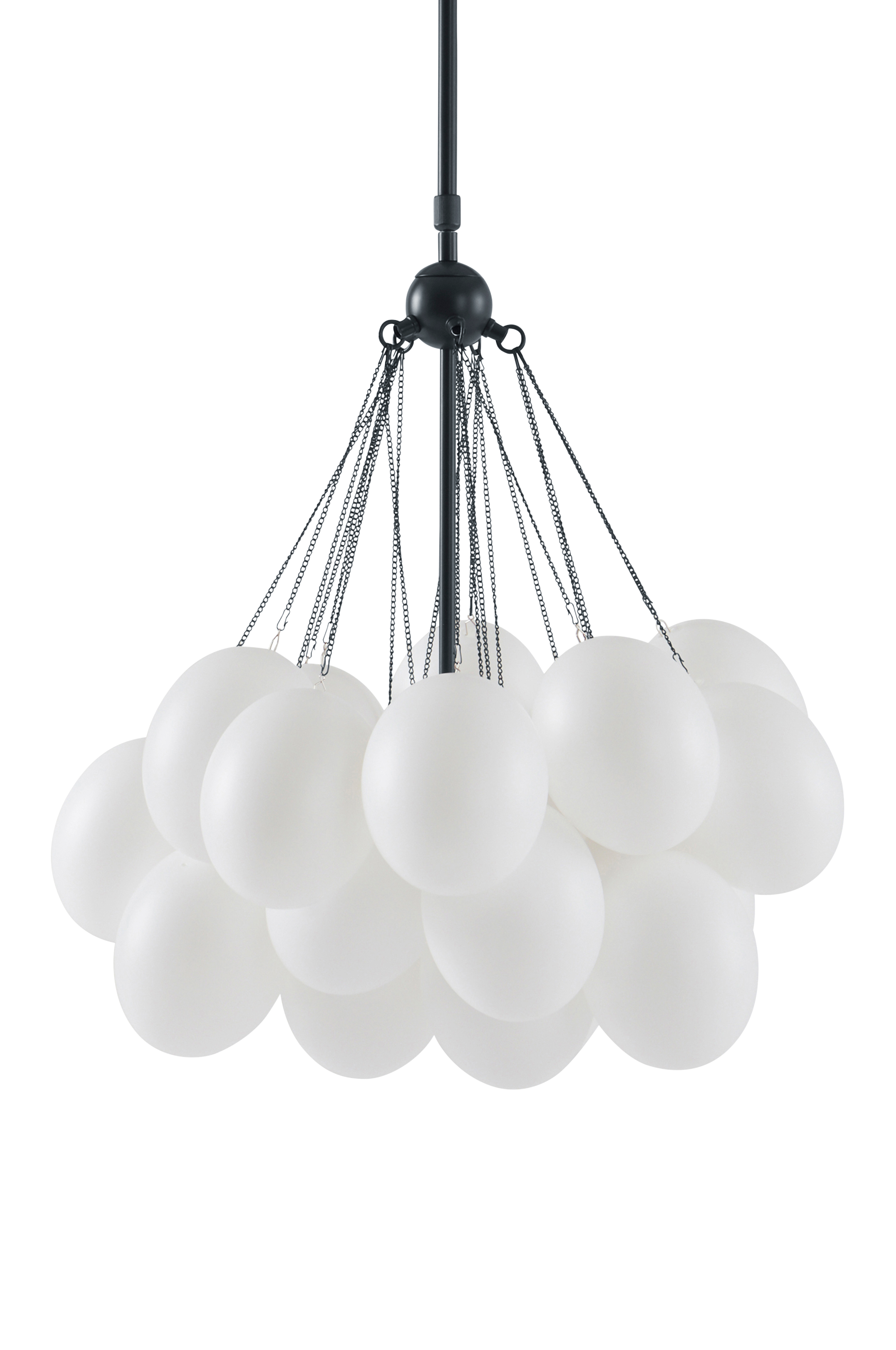 Loftslampe med 21 runde kugler af opalglas, i fem af kuplerne er der en lysestage, som får lampen til at sprede et behageligt skær. Kuplerne hænger i en flot klynge og danner en storslået og spændende loftslampe over f.eks. spisebordet. Stellet og loftskoppen er lavet af jern.
