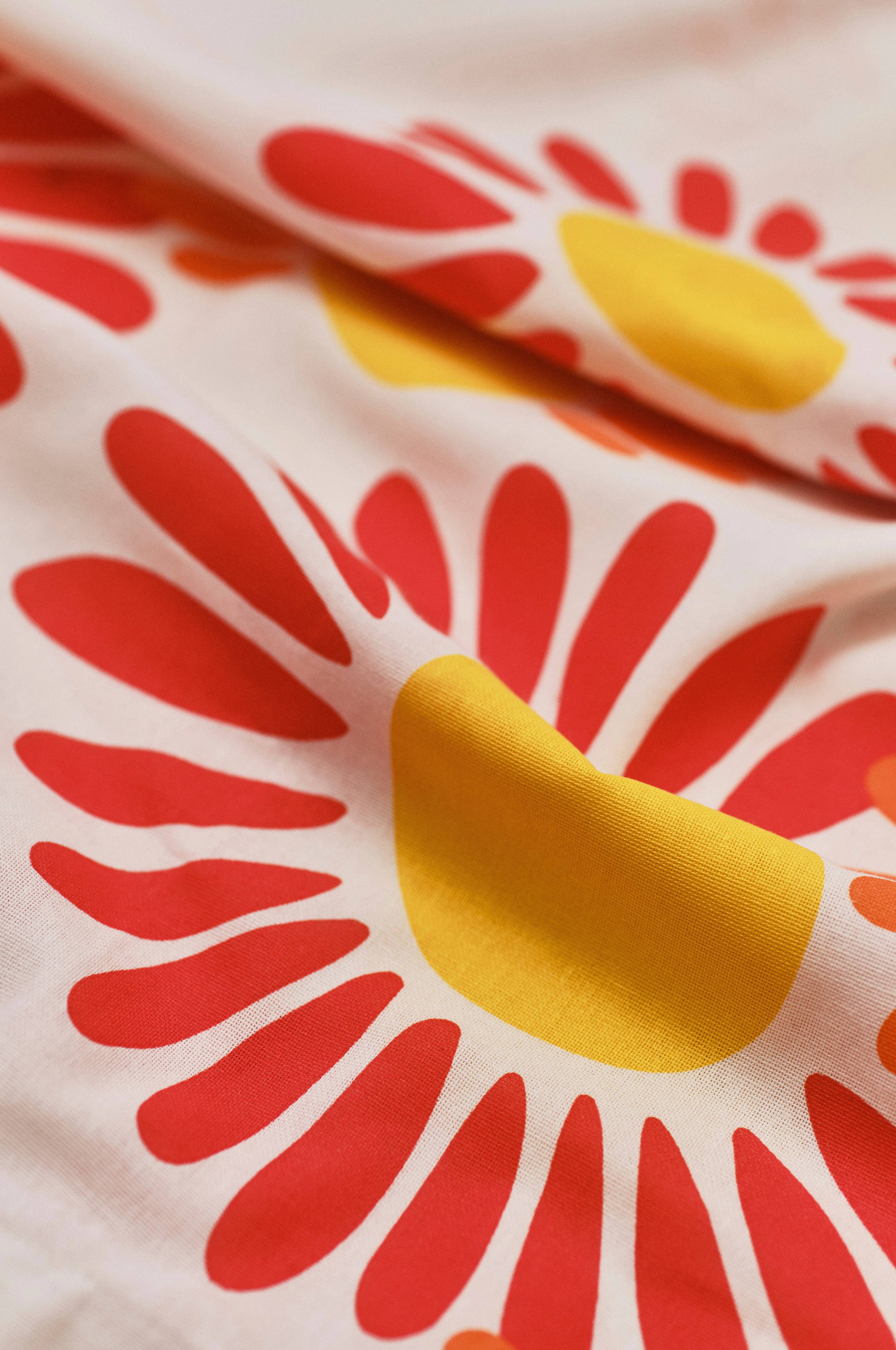 SOLIS-rullegardinet giver et levende touch med sin hvide base og farverige røde, orange og gule solsikkedesign. Dets muntre udseende og praktiske bindebånd gør det til et tiltalende indretningsvalg til moderne interiører og forbedrer ethvert rums atmosfære.