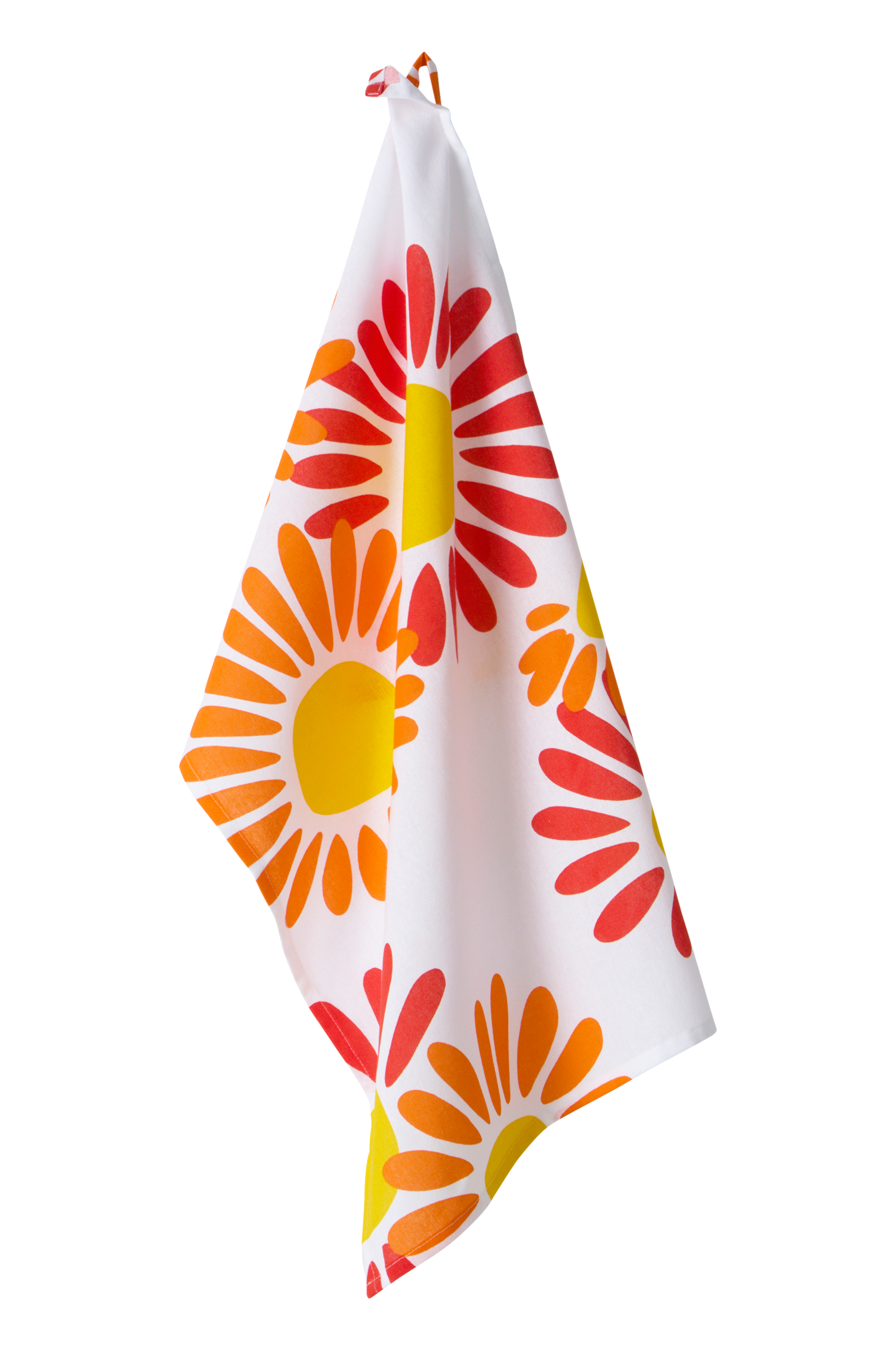 Dette køkkenhåndklæde har et levende solsikkeprint, der giver dit køkken et livligt præg. Blandingen af røde, orange og gule nuancer på en hvid baggrund kombinerer funktionalitet med et stilfuldt design, der forbedrer din boligindretning.