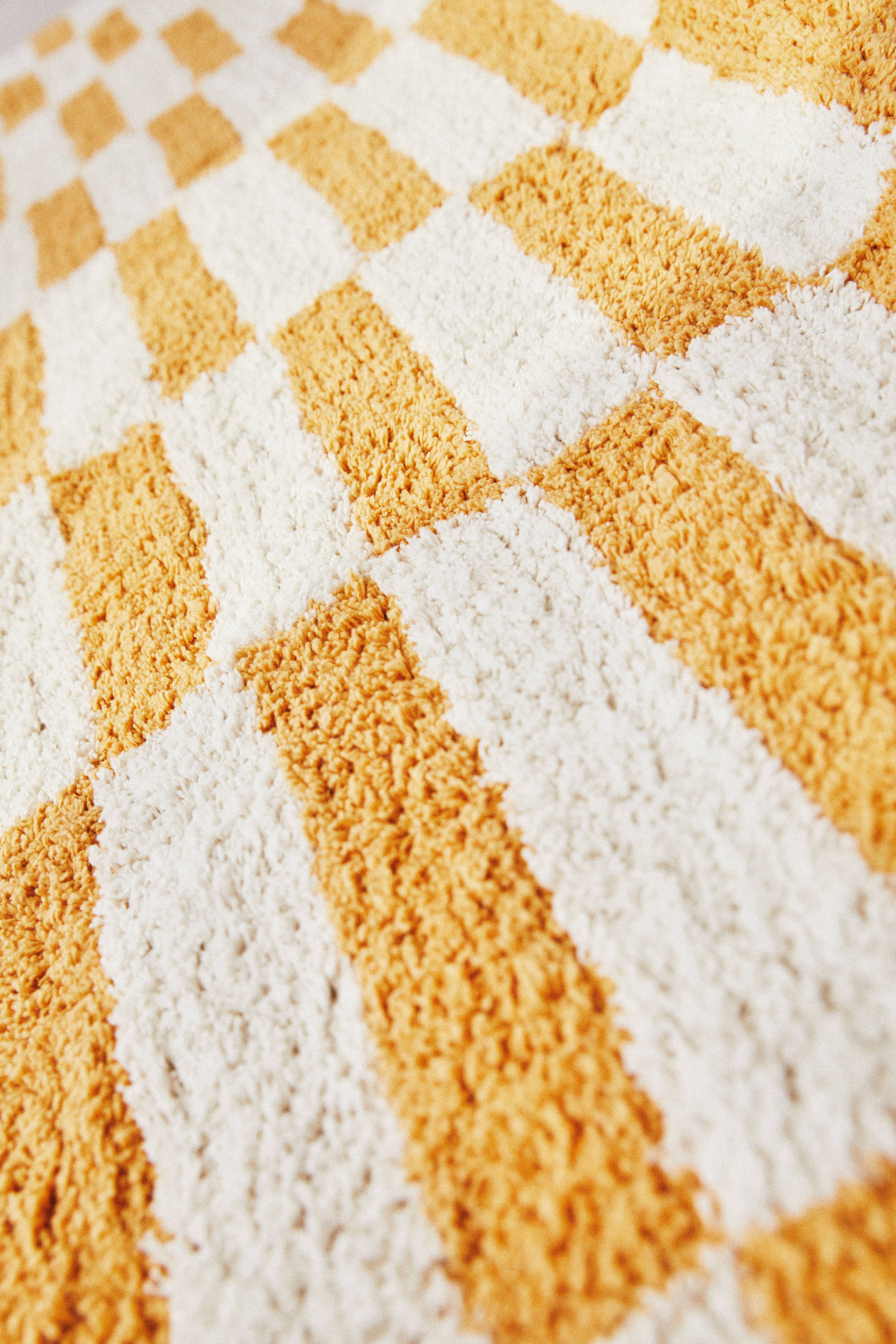 Bomuldstæppe af økologisk bomuld. Det smukke tæppe har blød luv med garnfarvede rektangler, og det har en vævet, naturfarvet kant hele vejen rundt. Luvhøjde 1-1,5 cm. Tykkelse 2 cm. 1300 g/m².