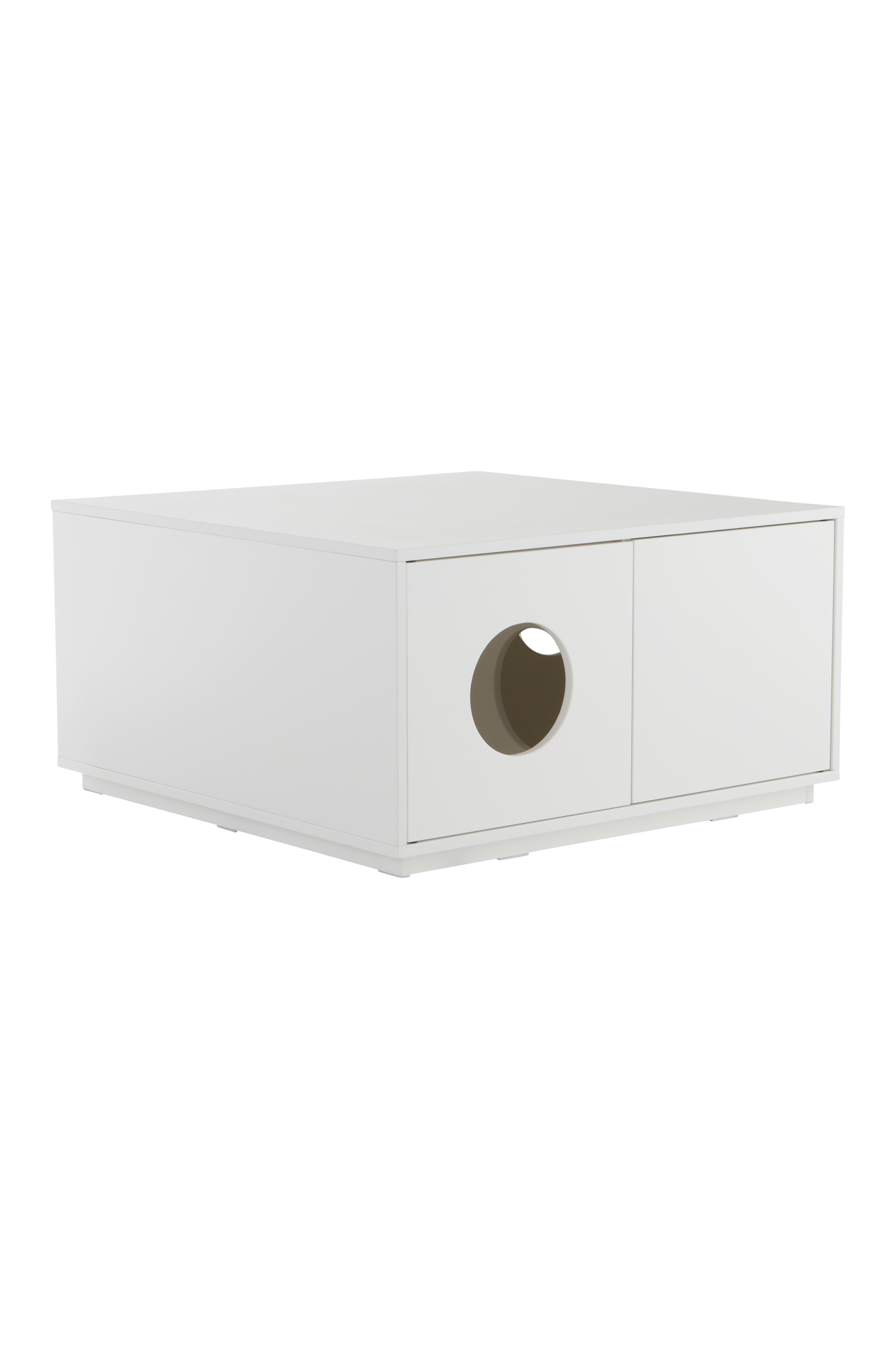 SULLI PETS sofabord til dig, der har en lille kat derhjemme, som gerne vil være med og putte sig ved sofaen. Bordet er af FSC-certificeret MDF. Sofabordet er opdelt i fire rum og mellem rummene er der huller, så katten kan bevæge sig imellem dem. Bordet har fire låger med skubbefunktion og to af dørene har huller, så katten kan hoppe ind og ud, når det passer. Bordet er malet med vandbaseret maling. Skal færdigsamles. Samlevejledning medfølger.