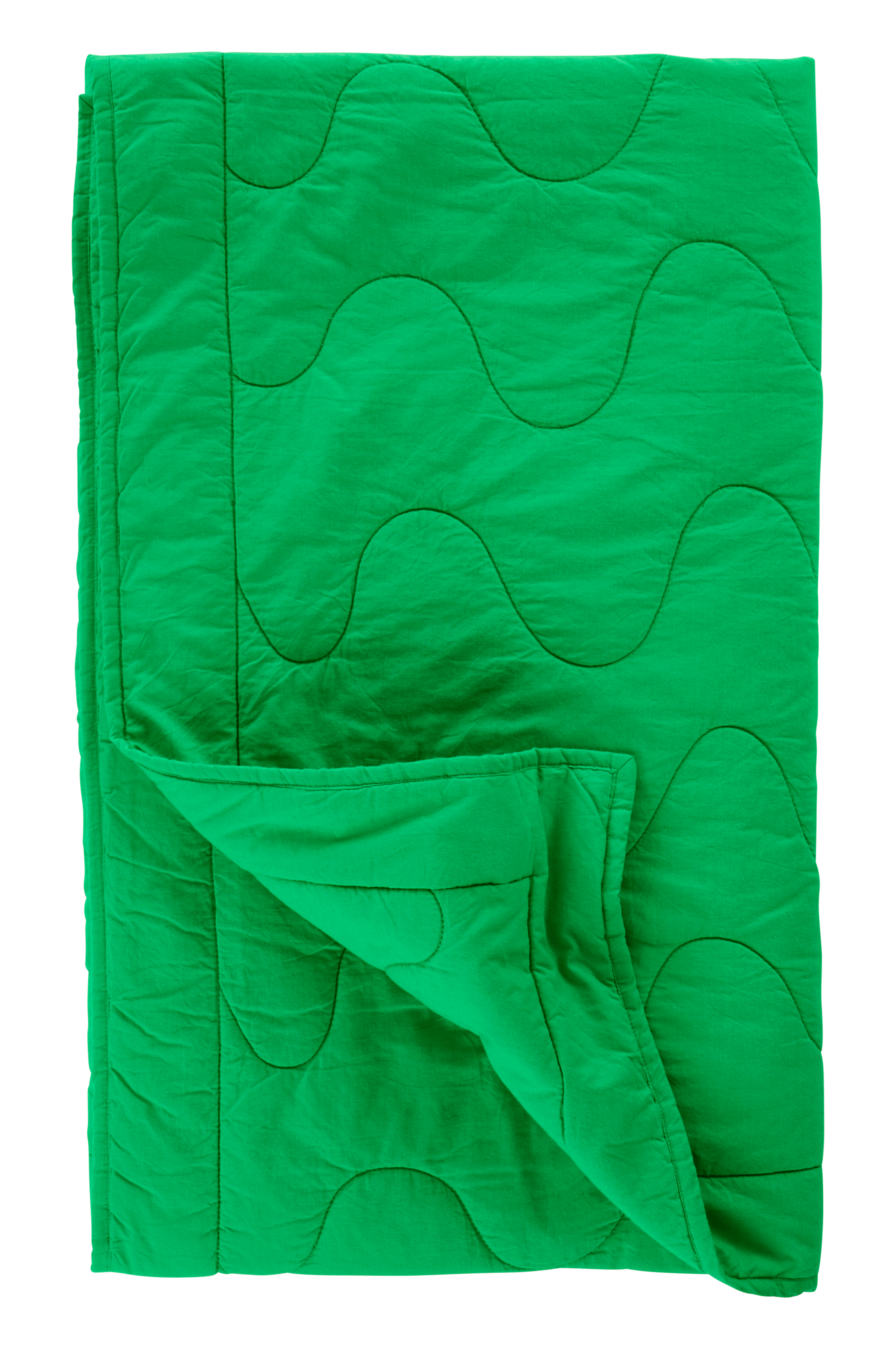 Sengetæppe, der er tyndt og fleksibelt, nemt at rede op med, behageligt som et ekstra tæppe og nemt at vaske. Stoffet er økologisk bomuld og har et quiltet bølgemønster, sømmen er i en anden farve. Sengetæppet har polyestervattering, der holdes på plads af sømmene. Det skønne bomuldsstof er stykvasket så det er ekstra blødt og dejligt. Sengetæppet er vendbart med to ens sider.