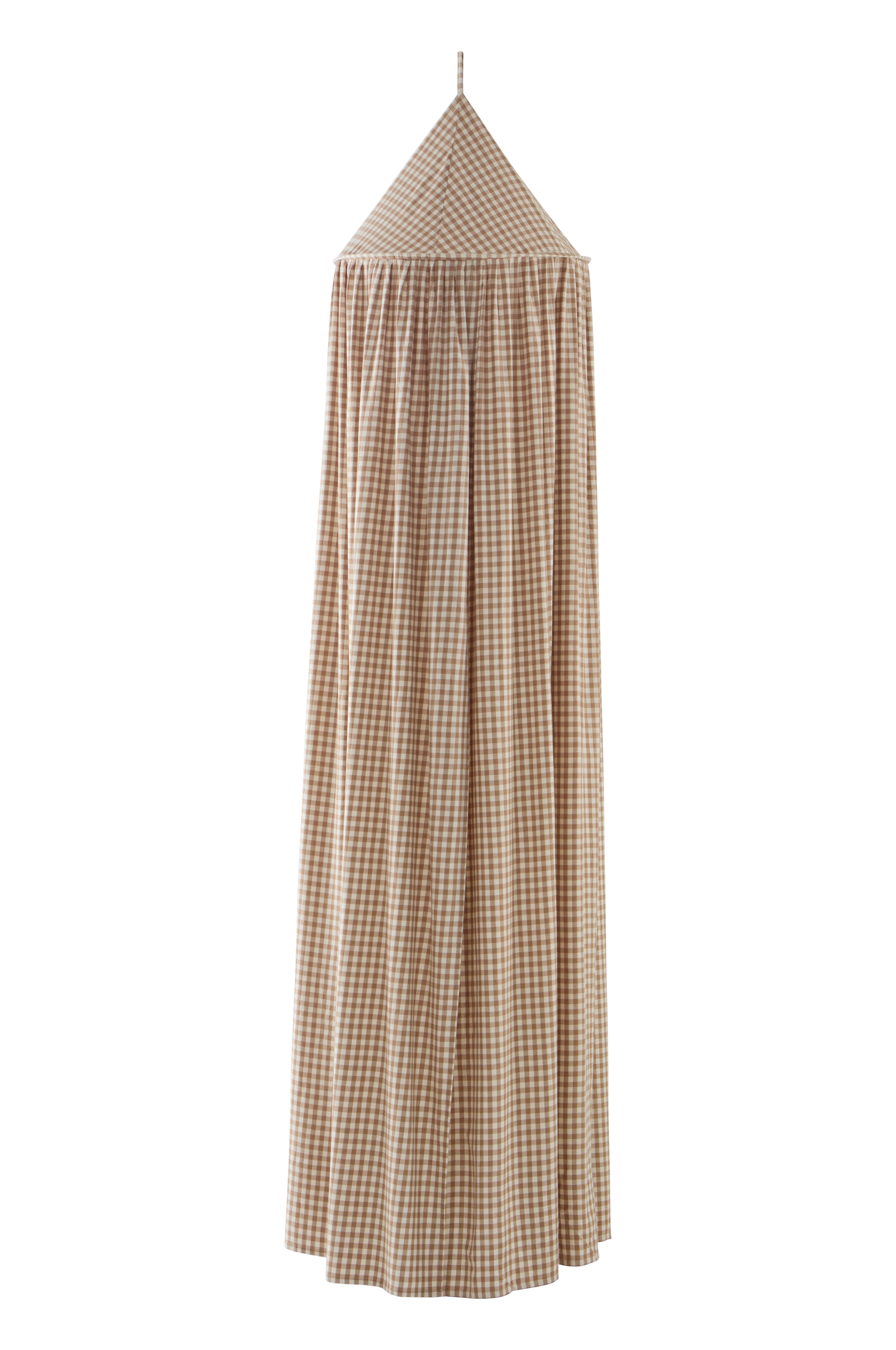 Sengehimmel af blødt, ternet vævet bomuld, forvasket for komfort. Den har et levende gingham-mønster, er rund i toppen og åben foran og skaber en hyggelig atmosfære over barnets seng.