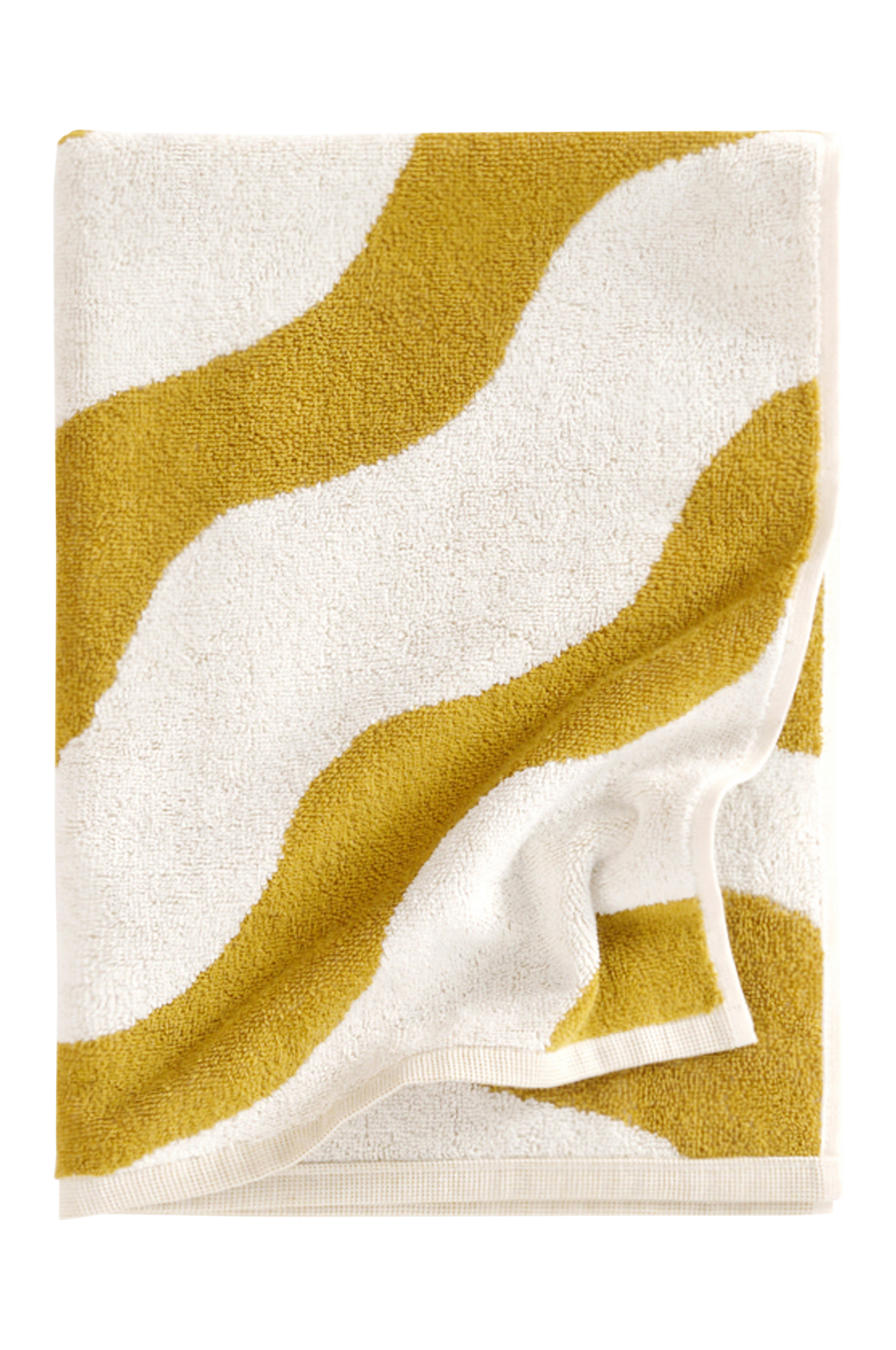 Blødt bomuldshåndklæde med et dynamisk bølgemønster. Den dobbelte garnkonstruktion øger sugeevnen og komforten. Håndklædet er indfarvet, så det holder længe, og det kombinerer praktisk anvendelighed med moderne design og tilfører ethvert badeværelse moderne flair.