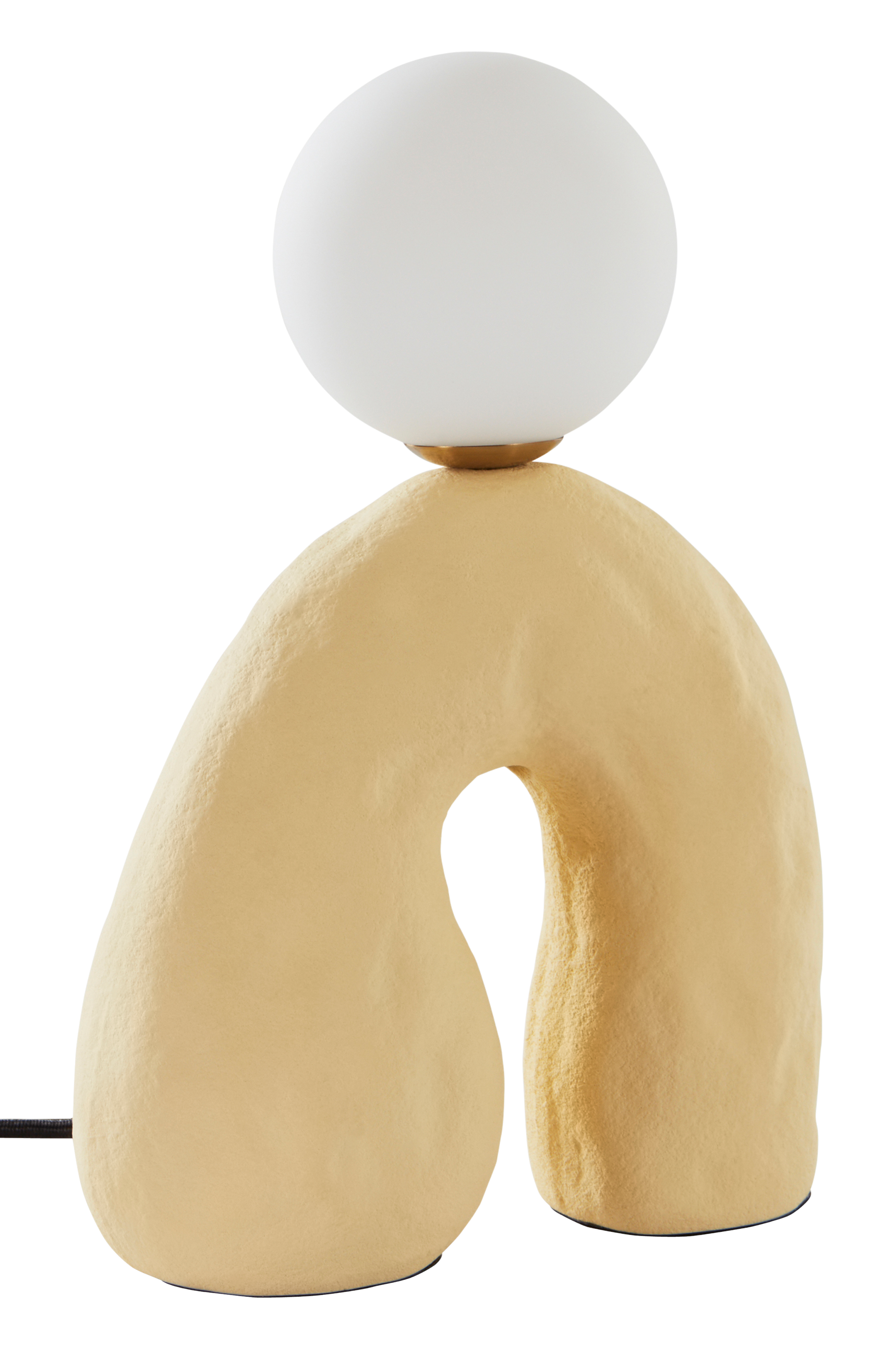 Bordlampe med asymmetrisk og blødt formet fod af keramik. Den runde kugle er af opalglas. Lampen har sort stofledning som forhøjer følelsen, strømafbryderen sidder på ledningen. Lampen er ujordet, klasse 2.