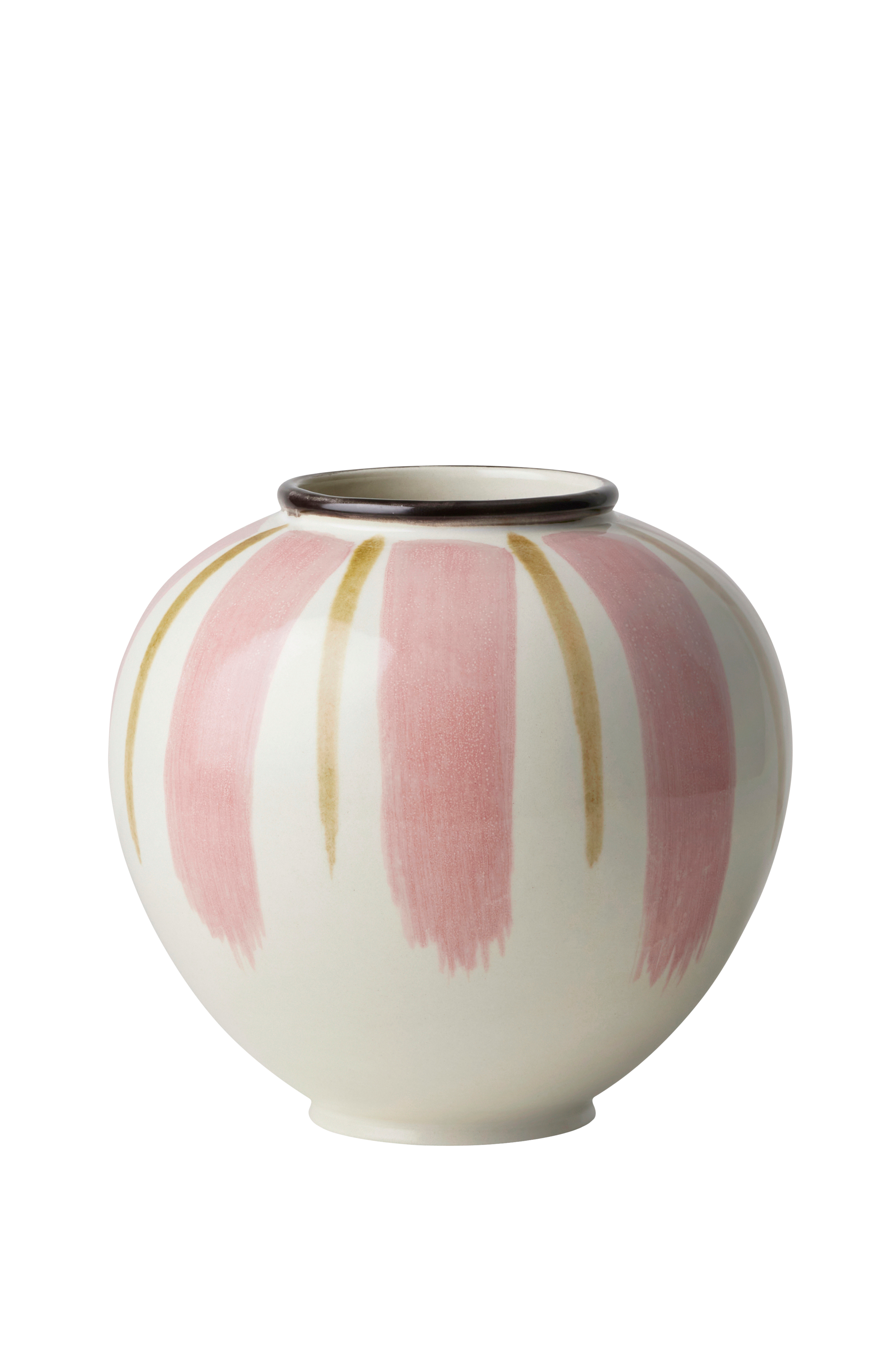 Med udgangspunkt i et ønske om at opdatere Kählers håndværksarv og klassiske teknikker tog Meyer Lavigne vaseformer fra arkiverne og skabte et autentisk, kunstnerisk udtryk med endnu mere dybde og liv takket være de dybe fylde glaseringer. Canvas handler om penselstrøgene og hensigten bag dem. Du kan tydeligt se, at vaserne er malet i hånden, hvilket giver et udtryksfuldt og levende udseende. I dekorationerne kan du ane designerens kunstneriske forståelse og intuitive bevægelser, som gør hver håndmalet vase til et lille kunstværk i sig selv. Vasen er 15 cm og dekoreret med lodrette penselstrøg som begynder oppefra og bevæger sig nedad. Penselstrøgene er brede og smalle på skift, og kanten langs vasens åbning har en transparent sort glasering som skaber en markant kontrast til de fint afstemte farver.