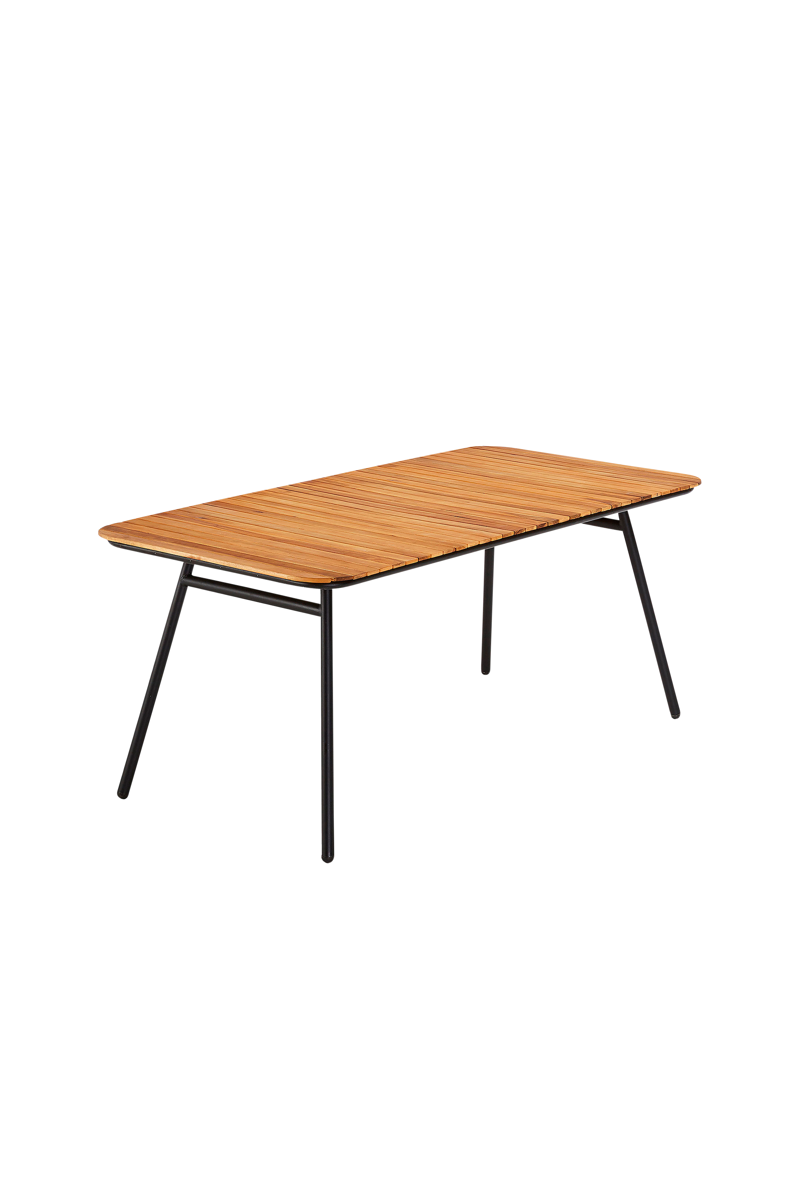 Bord med stel af pulverlakeret stål. Bordplade af akacietræ i naturfarve. Til brug indendørs og udendørs under tag. Bredde: 180 cm. Dybde: 90 cm. Højde: 75 cm.