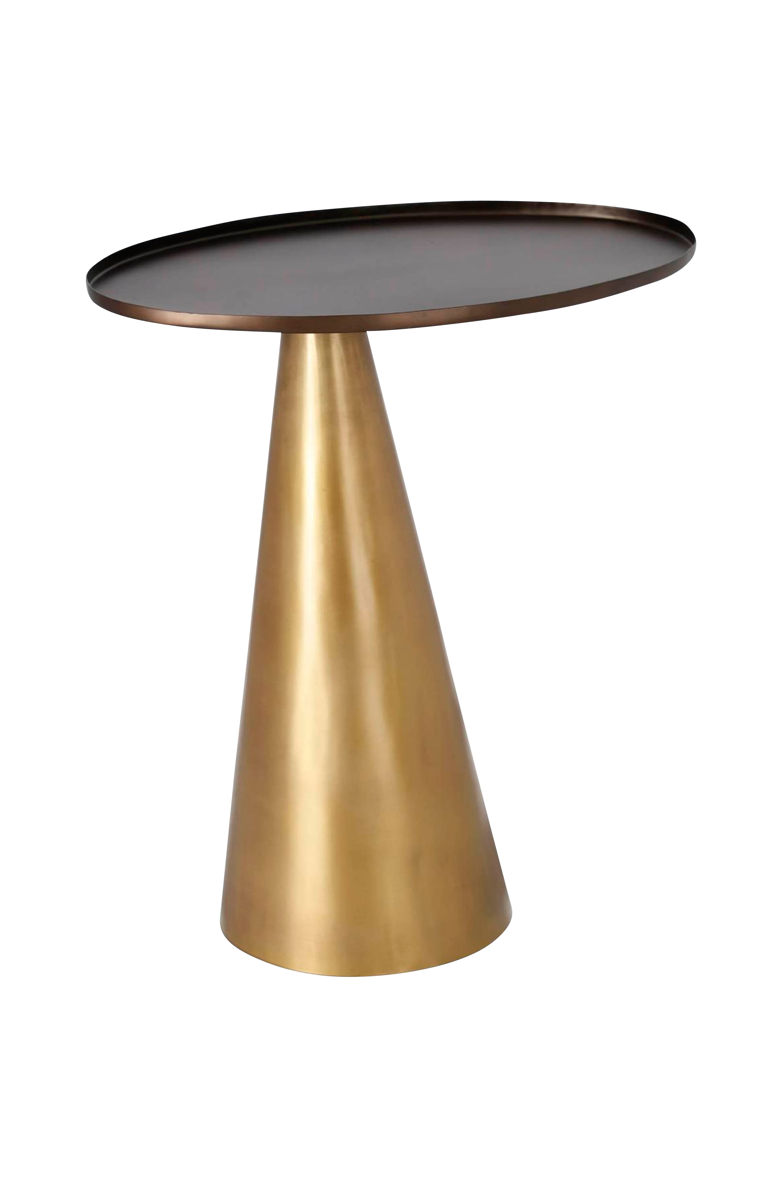 Liliane sidebord har et originalt design af metal med geometriske former; et kegleformet stel og en oval overdel. Overfladebehandlingerne er lige så markante som designet; et guldfarvet stel med antik-finish kombineret med en bronzefarvet overdel. Et perfekt møbel, der kan placeres i entreen, ved siden af sofaen eller endda bruges som sengebord. Bredde: 45,5 cm. Dybde: 27,5 cm. Højde: 52 cm.