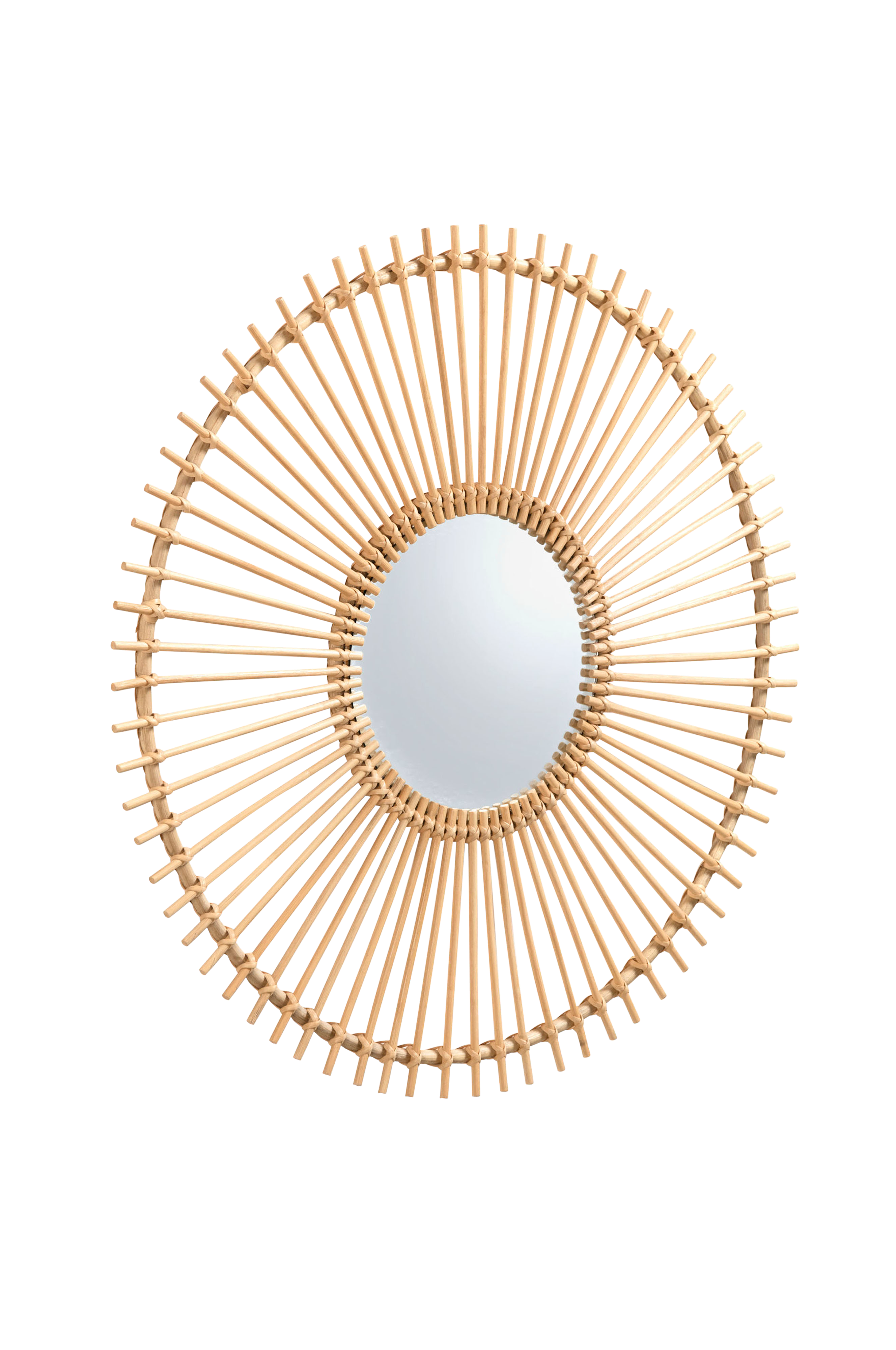 Louisa spejl med ramme af rotting i naturfarve, i et design, der ligner en sol. Det er 100% håndlavet. Rottingen er formet, behandlet og vævet i hånden. Hold en stor væg fri, for solens stråler er lange. Et solrigt design. Bredde: 81 cm. Dybde: 2,5 cm. Højde: 81 cm.