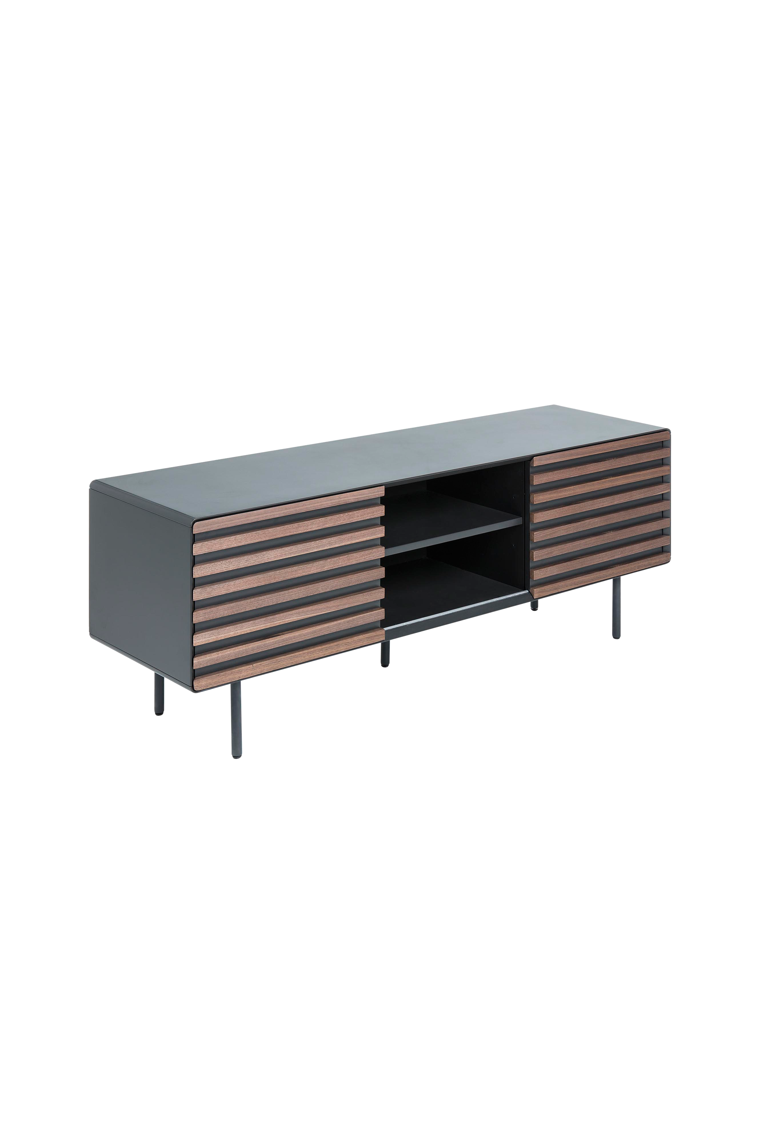 TV-bænk med stel i matlakeret, grafitgrå MDF. Forside med to skydelåger i valnøddefinér. Ben af metal. Bredde: 162 cm. Dybde: 45 cm. Højde: 58 cm.
