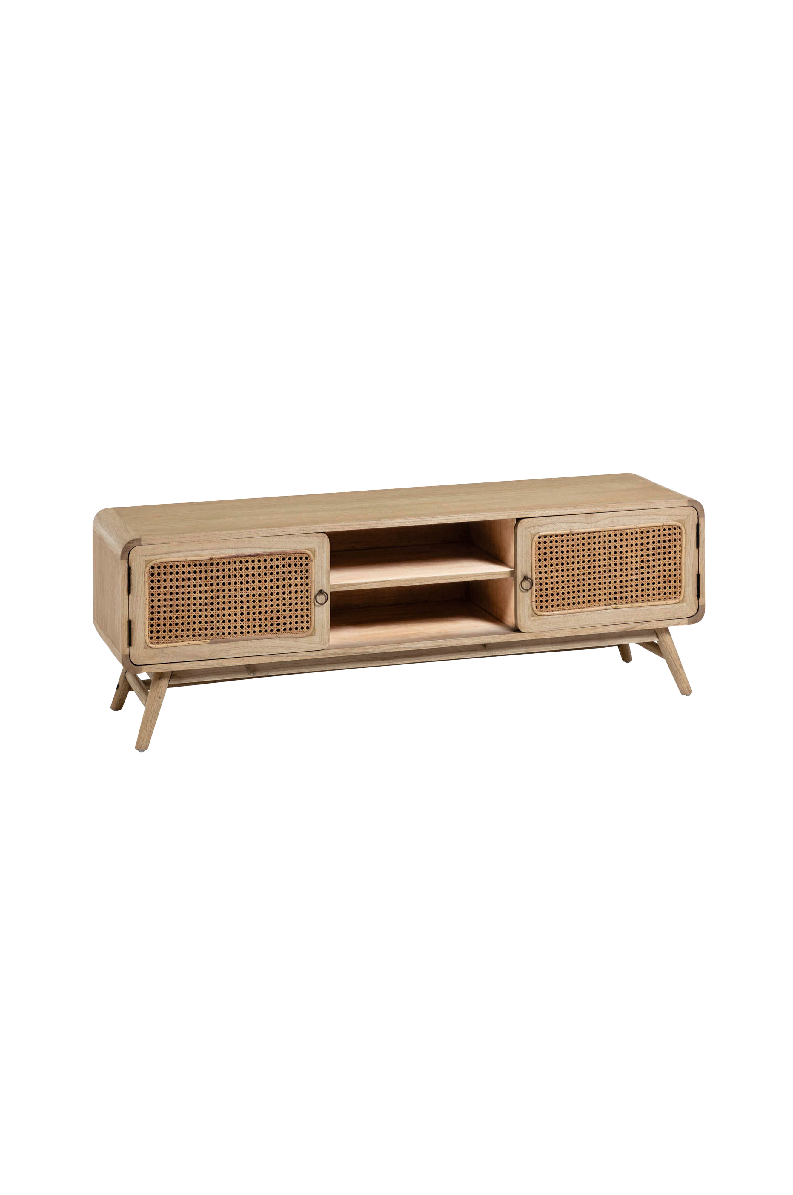 Nalu tv-bænk er fremstillet af massivt minditræ i patineret look. Til fremstilling af stellet er træet afrundet i hjørnerne. Fronten er fremstillet af håndvævet rotting, og det giver en trendy stil. Det er et miljøvenligt designermøbel, idet træet kommer fra bæredygtigt skovbrug, der anvender ansvarlig træfældning. Bredde: 150 cm. Dybde: 40 cm. Højde: 50 cm.