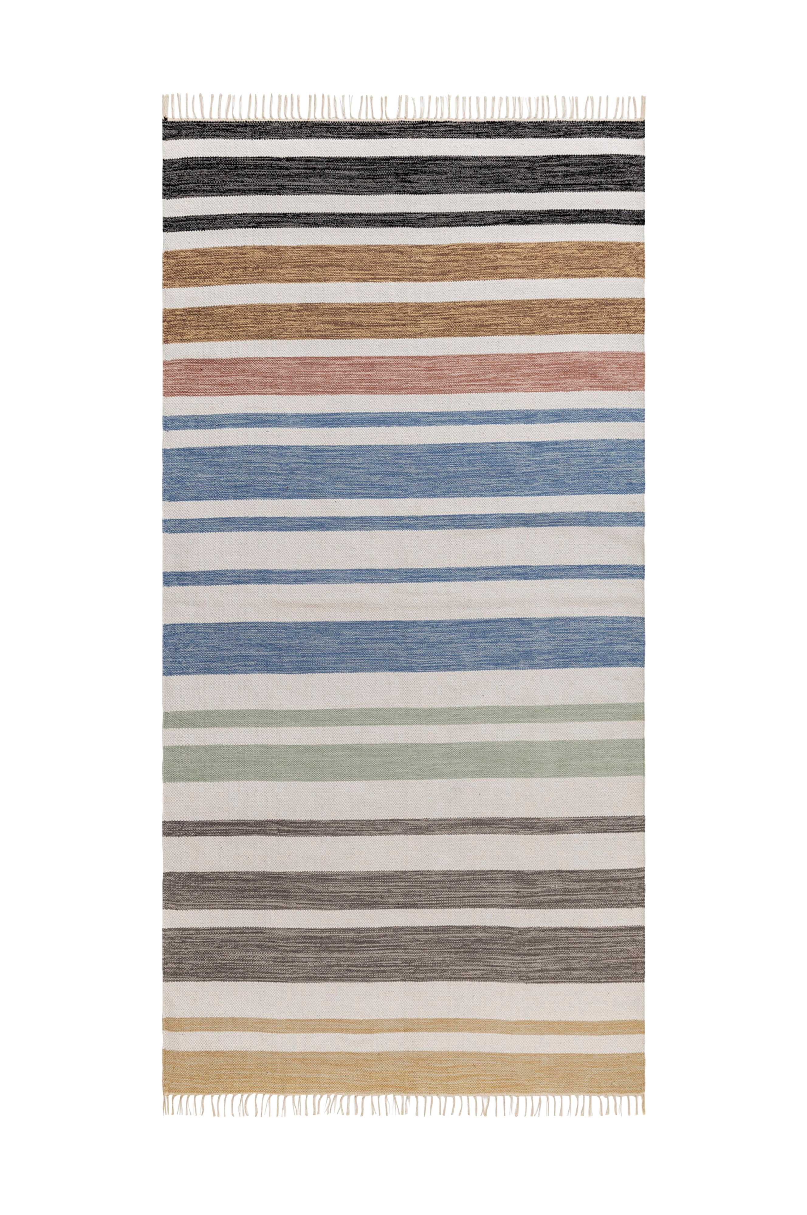 Dette tæppe er vævet af ren bomuld og er både slidstærkt og blødt, hvilket gør det til en perfekt tilføjelse til både moderne køkkener og hyggelige hjem på landet. Da hvert tæppe er håndlavet, kan der forekomme små variationer i vævning, farve og størrelse, hvilket gør hvert stykke unikt. En størrelsesvariation på ca. 3-5 % i forhold til de angivne mål er også en naturlig del af den håndværksmæssige produktionsproces.