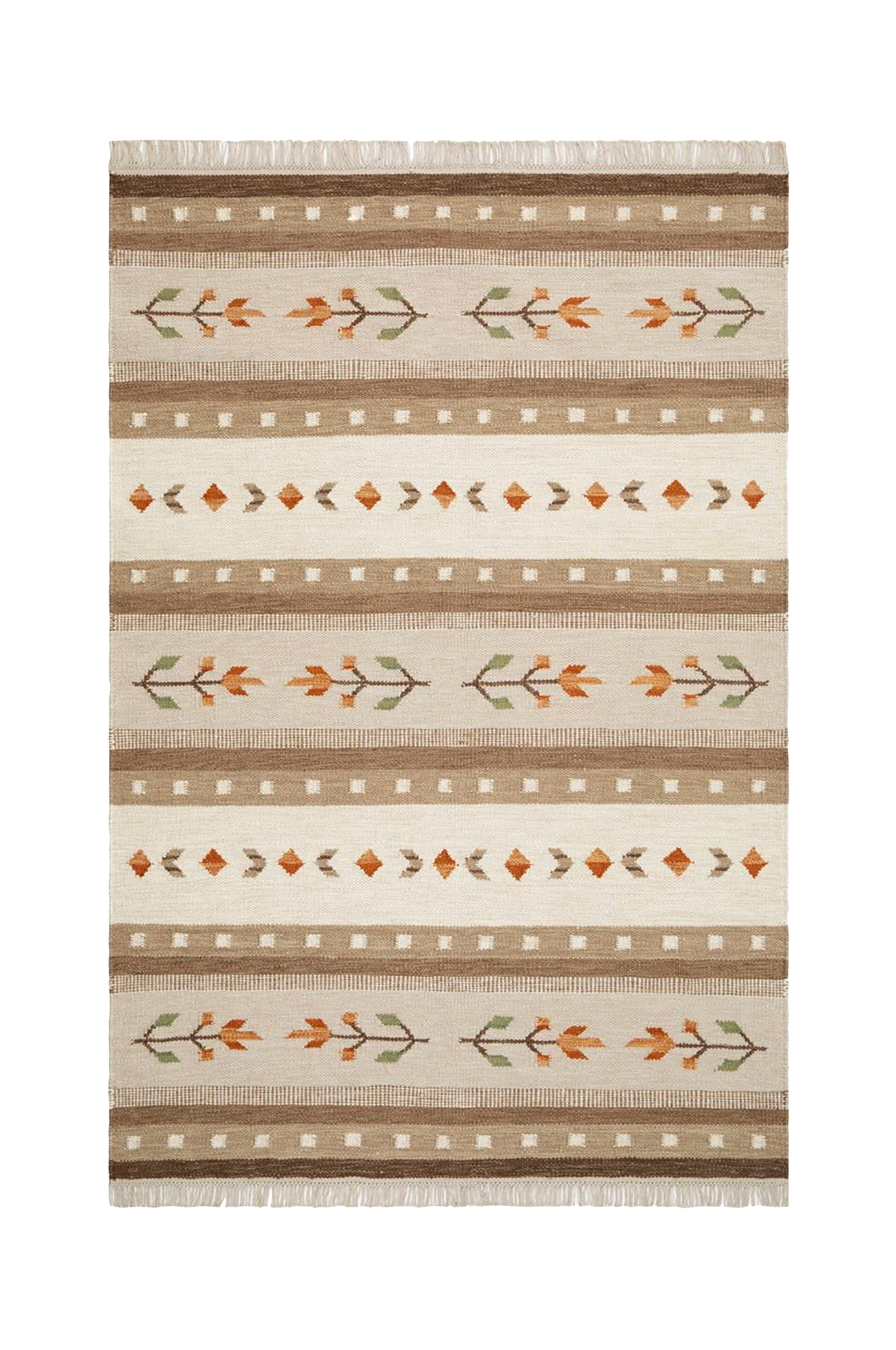 Vævet tæppe i uld i et klassisk mønster. Tæppet er vævet på en bomuldstrend, som giver tynde flotte frynser.