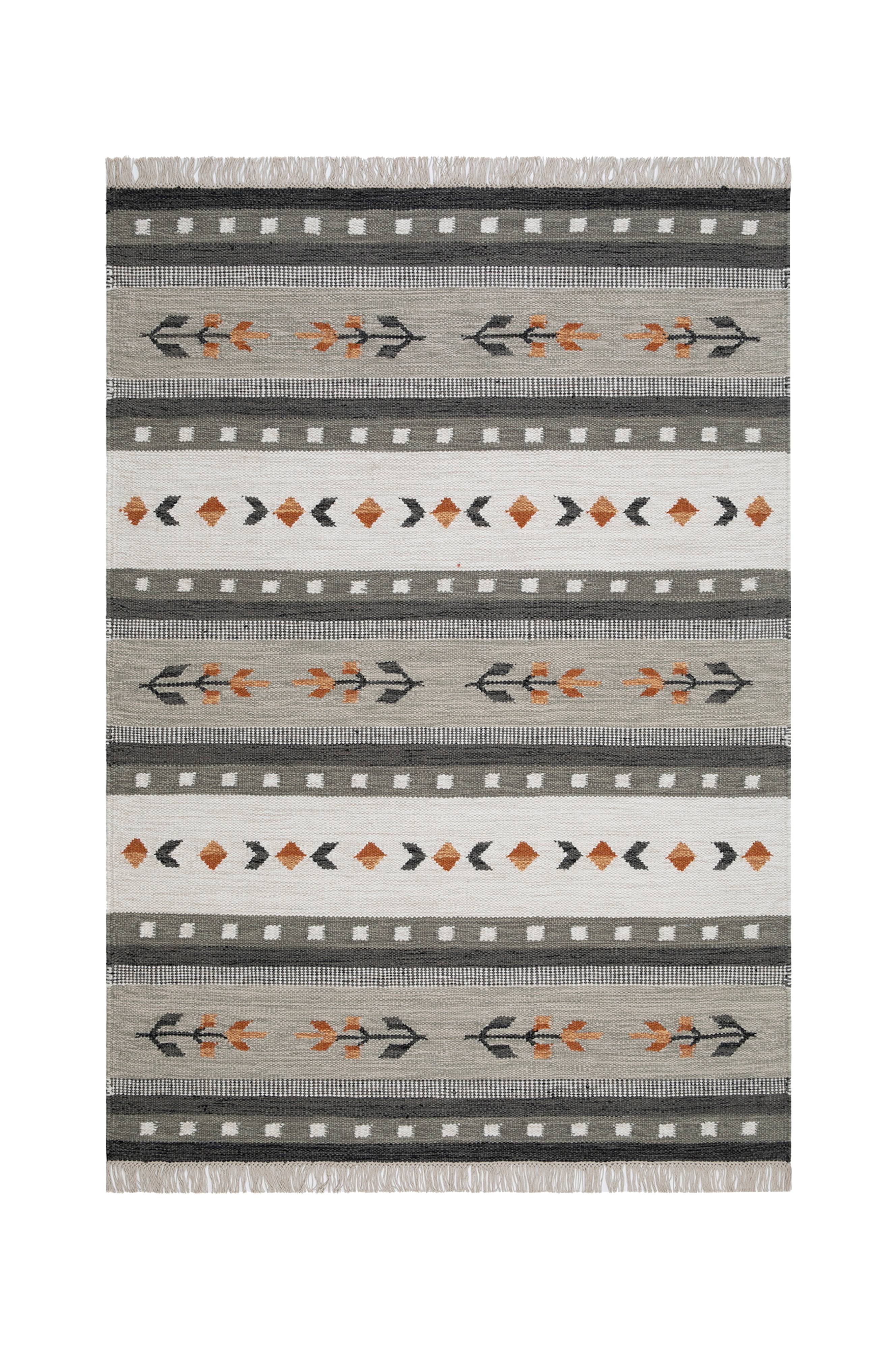 Vævet tæppe i uld i et klassisk mønster. Tæppet er vævet på en bomuldstrend, som giver tynde flotte frynser.