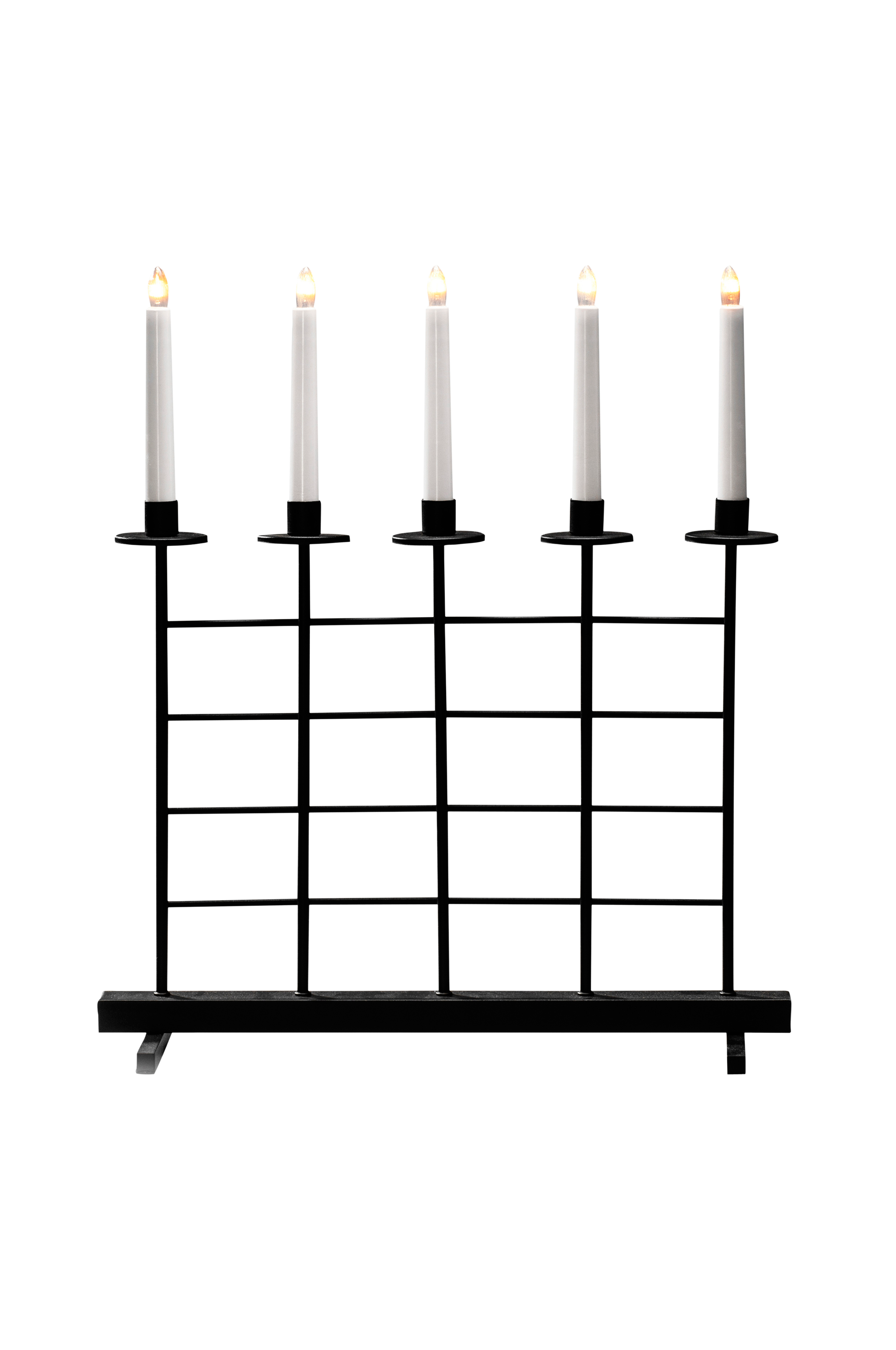 En 5-armet el-lysestage i lakeret metal. Varmt hvide pærer. Drives med en 24 V transformer. Tilslutningsledning på 1,8 meter med afbryder på ledning for manuelt sluk/tænd. Højde 51 cm og bredde 44,5 cm.