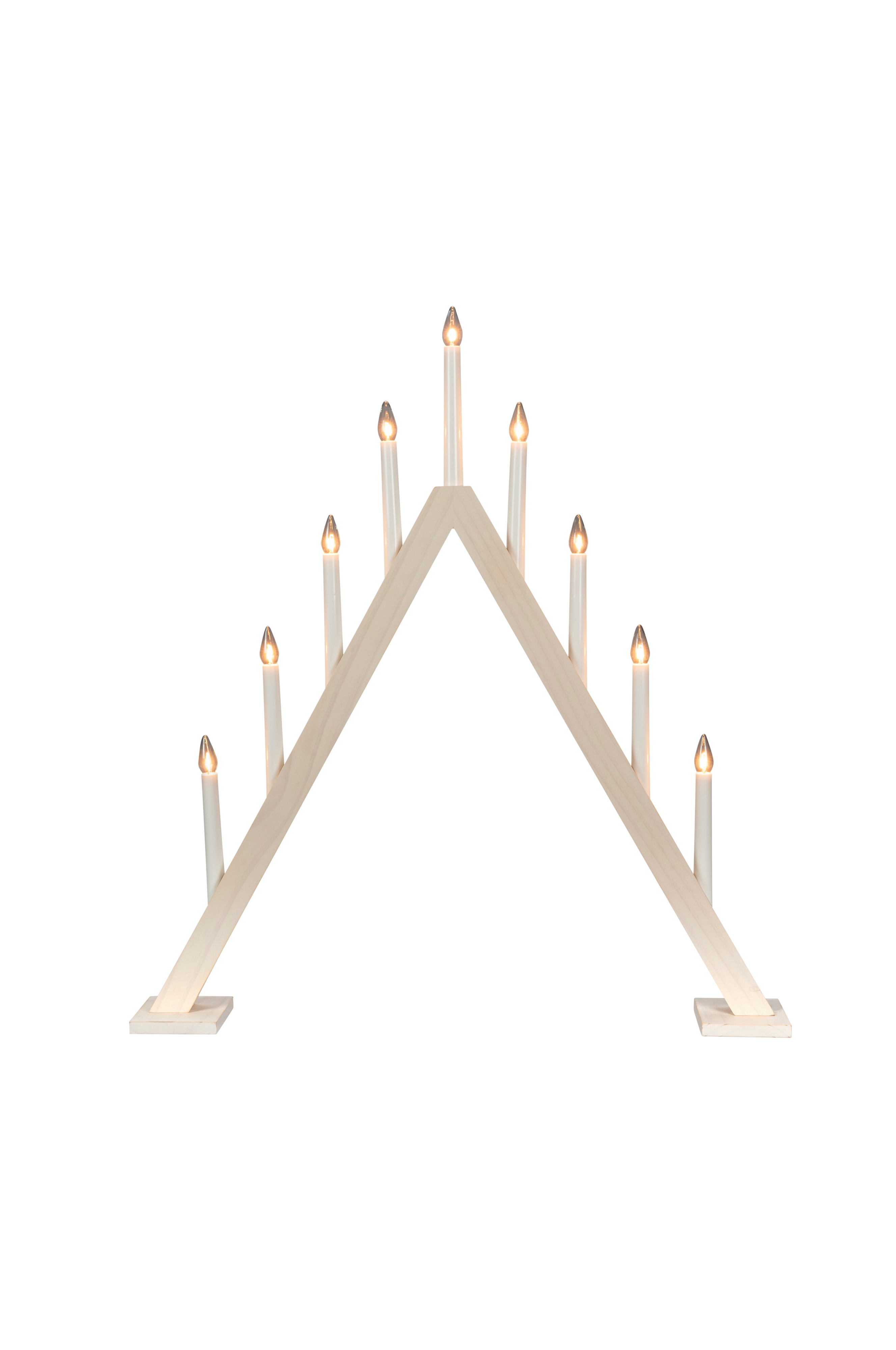 En elegant kandelaber i hvidkalket træ, der giver et varmt, moderne touch til dit hjem. Kontrasten mellem den lyse træfinish og den varme hvide glød skaber en indbydende atmosfære. En klassisk juledekoration med et moderne udtryk - perfekt til vinduesbelysning i adventstiden.