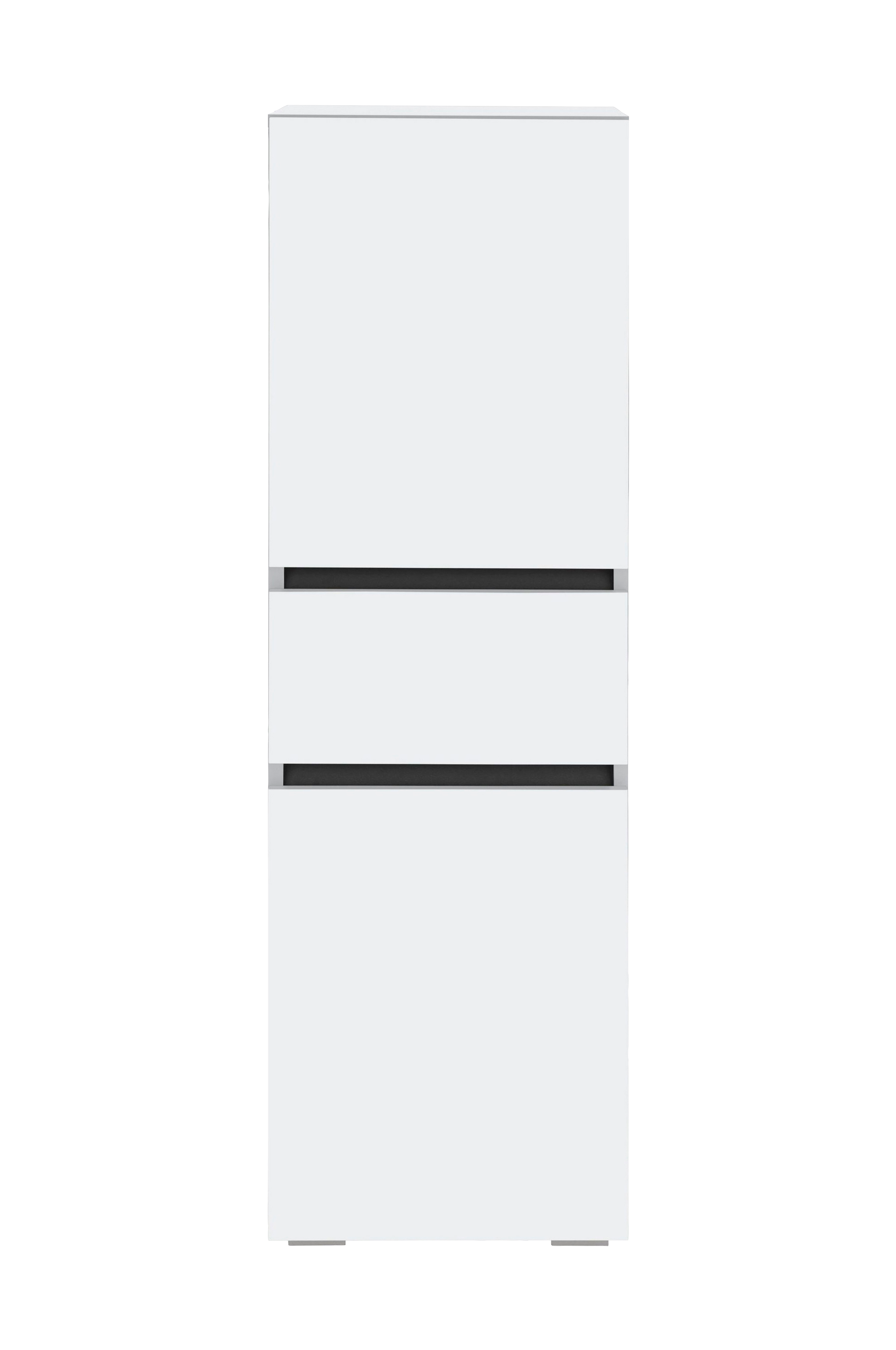 Det elegante og moderne midi-badeværelsesskab er pladsbesparende og rummeligt på samme tid og kan nemt integreres i dit badeværelse. Det overbeviser med sit moderne, tofarvede design i et tidløst look, der passer til mange badeværelsesmøbler. Det er opdelt i to låger med udskiftelige hængsler og en skuffe. Indvendigt giver badeværelsesskabet masser af plads til toiletsager, håndklæder eller badeværelsesredskaber. Takket være højdejusterbare hylder kan rummenes størrelse tilpasses indholdet. Opbevaringsskabet er fremstillet af træbaserede materialer, der er fsc-certificerede. De har en belægning af høj kvalitet, hvilket giver overflader, der er lette at vedligeholde. Fås i flere farver.