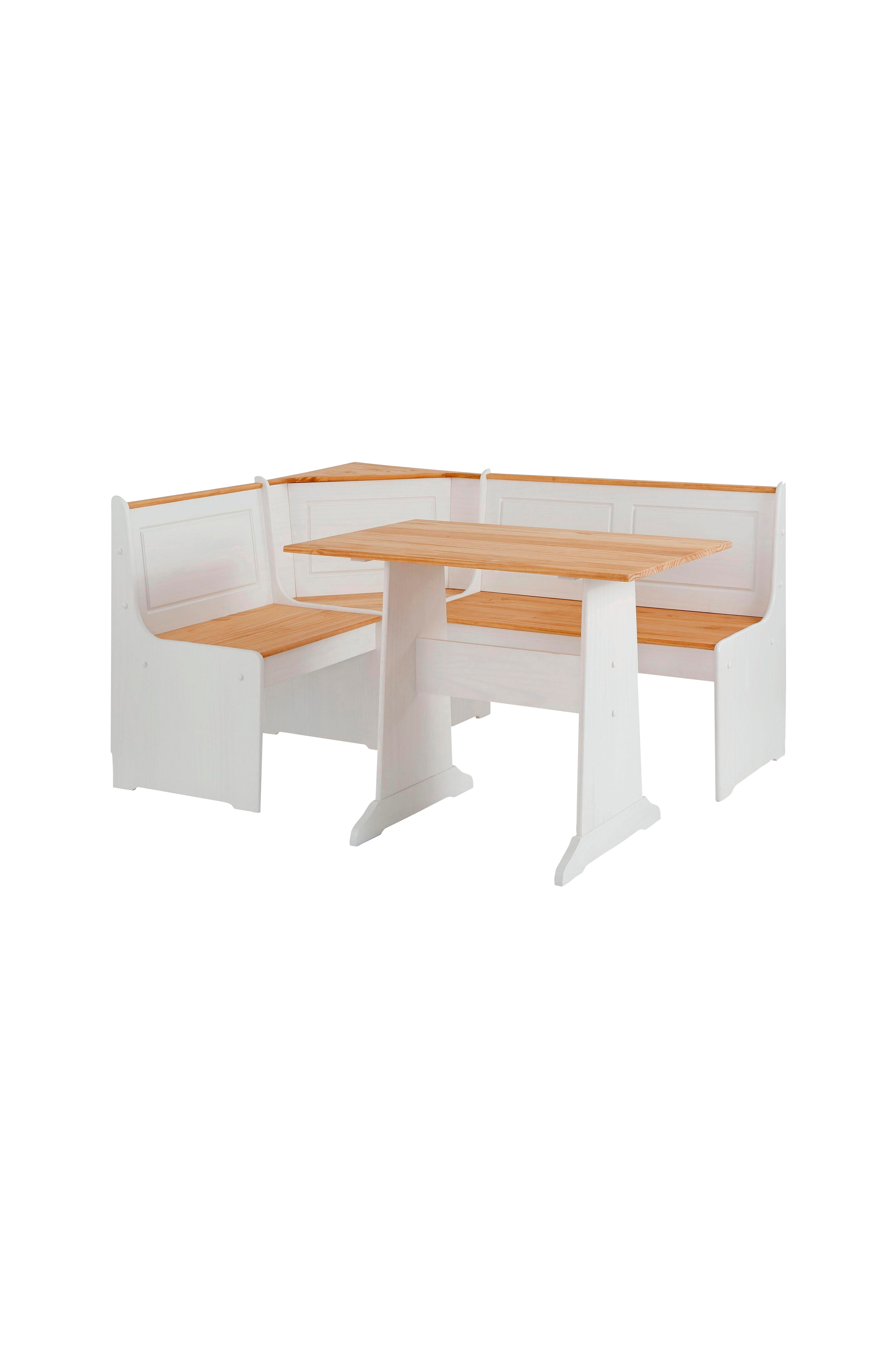 Inviterer til en hyggelig sammenkomst: det 5-delte spisebordssæt i landlig stil. Med sit naturlige design kan det integreres i mange boligstile. De afdæmpede farver og de smukke elementer i trælook er med til at give sættet sit udseende. Spisebordsgruppen består af et rektangulært bord og en praktisk brysthjørnebænk, som udnytter den tilgængelige plads i dit rum ideelt. Der er to kister under hjørnebænkens sæde, hvor du finder nyttig opbevaringsplads. Bordgruppen er fremstillet af fsc®-certificeret massivt træ. Fremtryller en hyggelig atmosfære: spisesættet i landlig stil fås i forskellige farver.