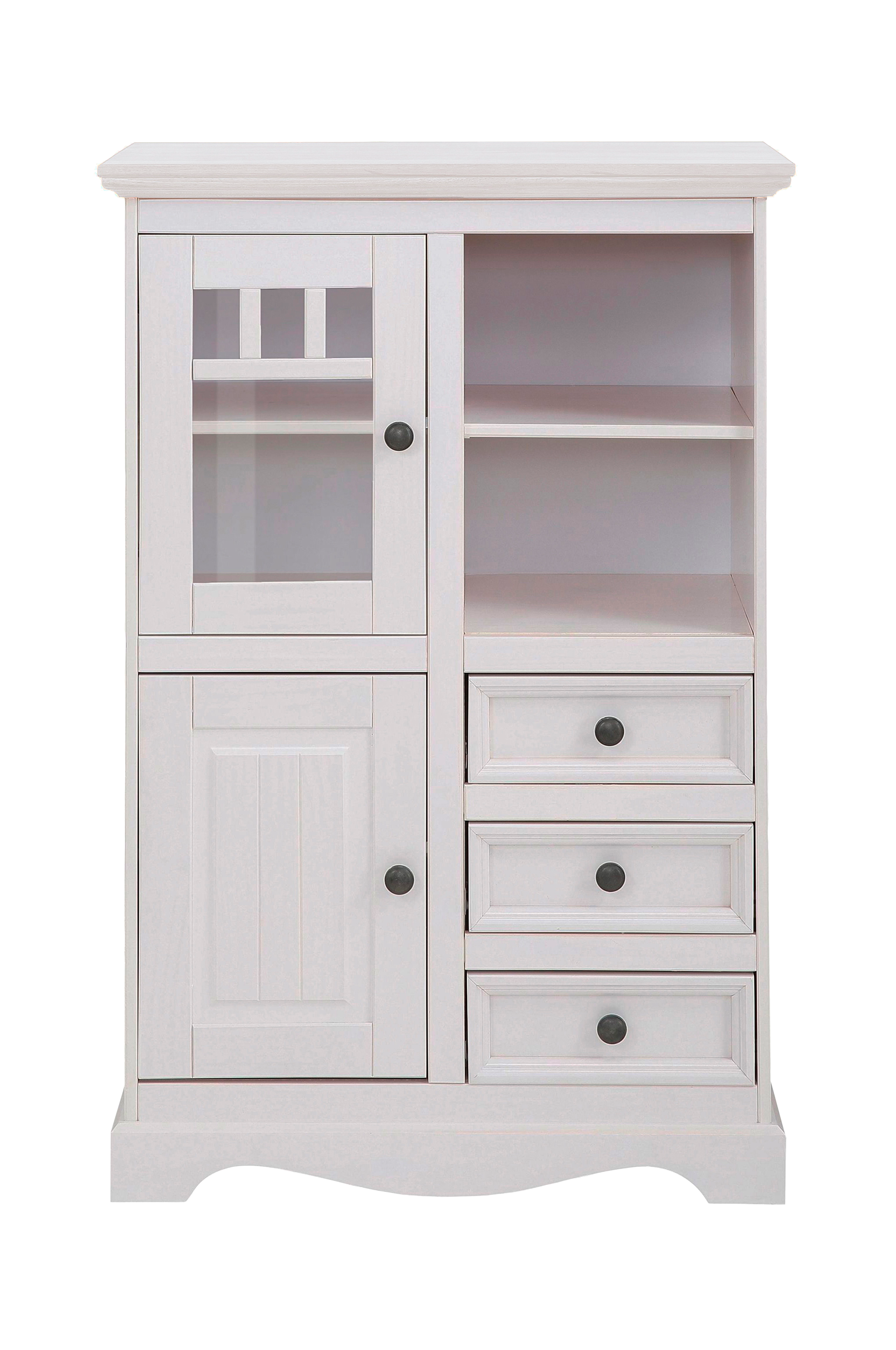Et mirakel af opbevaringsplads i klassisk landhusstil: dette highboard kombinerer form og funktion på en elegant måde. Fordi skabet er lavet af fsc-certificeret massivt træ og dekoreret med smukke fræsninger. Andre designmæssige highavana-lakeringer er de smukke metalhåndtag og lågen med glasindsats. Og opbevaringskonceptet i dette vitrineskab er også overbevisende: Rummet med trælågen og skufferne i det nederste område giver masser af plads til opbevaring. I den øverste del af skabet kan pyntegenstande præsenteres i de åbne rum eller i udstillingssegmentet.