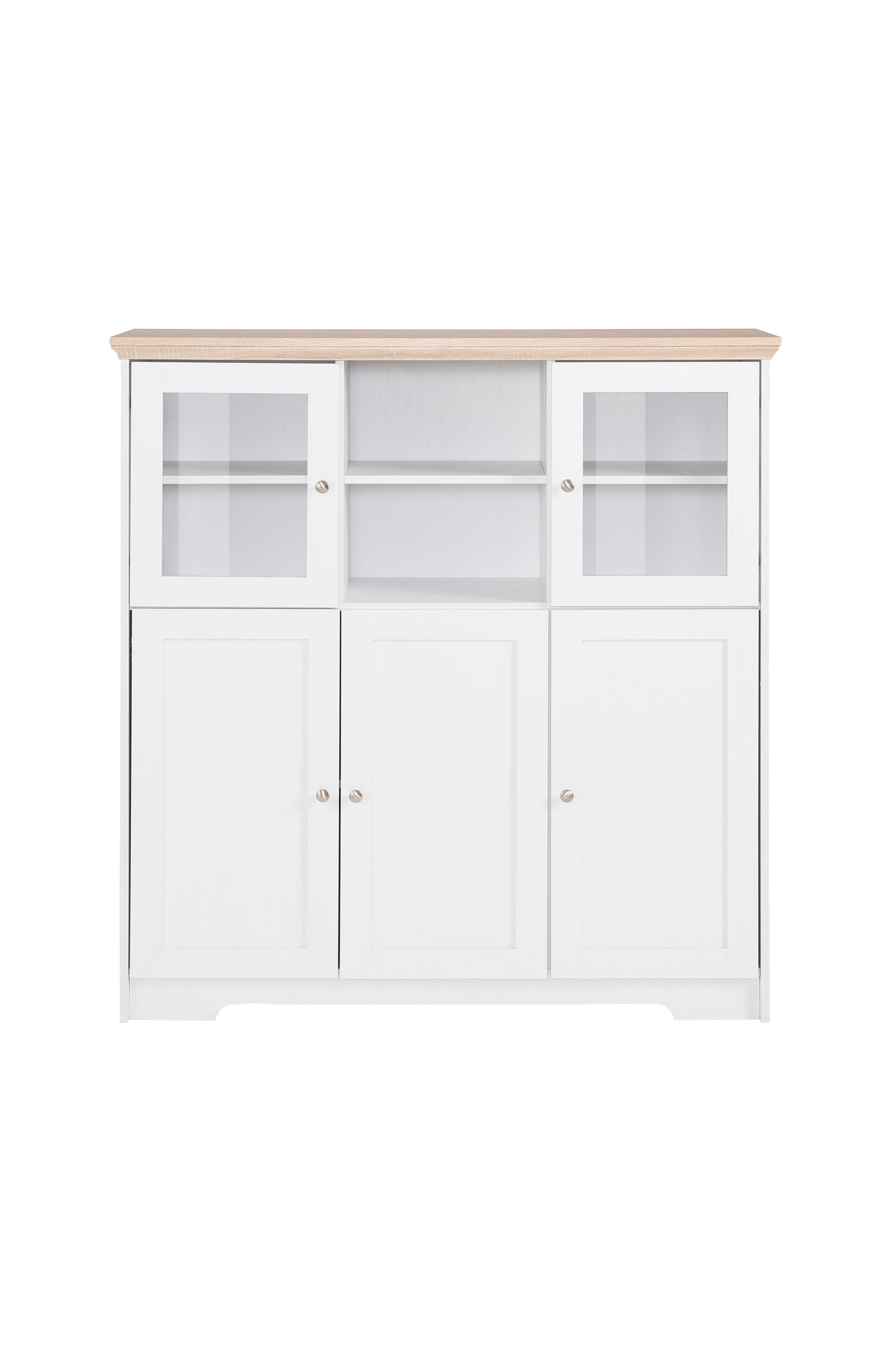 Det smukke highboard har en moderne landlig stil. Det er smukt designet og fås i forskellige farver, så det harmonerer med forskellige indretningsstile. Det giver masser af plads til pyntegenstande, service, bøger og meget mere. Der er flere rum til opbevaring bag både træ- og glaslågerne - der er også åbne niveauer i midten. Korpus af fsc-certificeret træmateriale og de duroplastiske overflader i egetræslook vidner om materialets gode kvalitet. Alt er også af høj kvalitet og let at vedligeholde.
