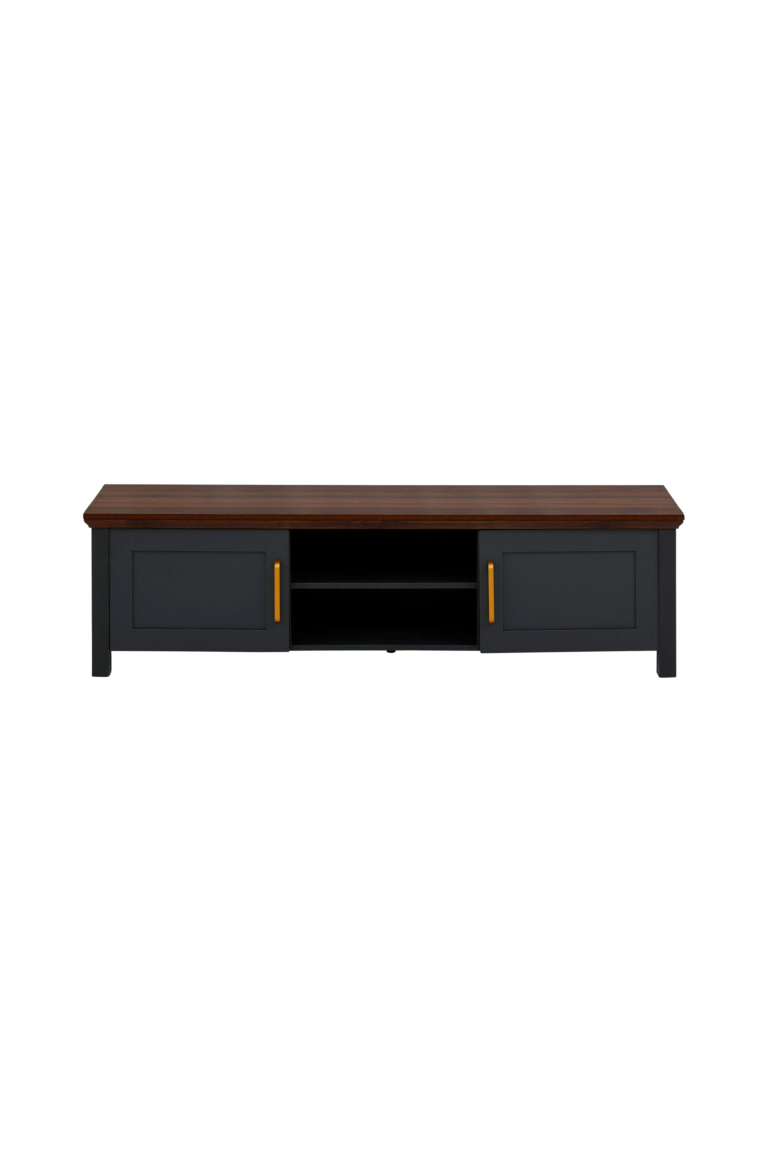 Lowboardet i høj kvalitet med kabelkanal fremhæver dit rum. Et toppanel med trælook, farvede metalhåndtag og høj kvalitet i fremstillingen gør dette lowboard til et blikfang i stuen. Takket være det subtile farvedesign passer det nemt ind i dit eksisterende møblement. Lowboardet er udstyret med en gennemføring, så du hurtigt og nemt kan tilslutte tv. Bag de to låger og i de åbne rum er der plads nok til bøger, spil og andre ting.