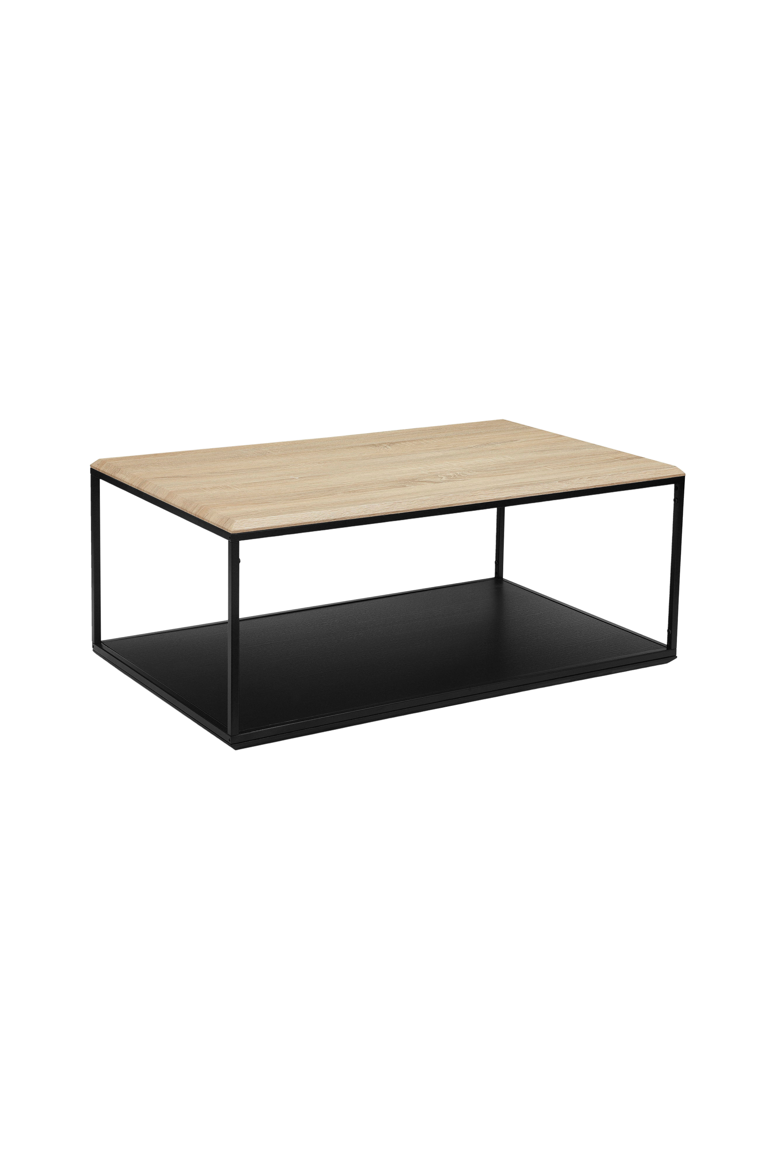 Vi præsenterer et moderne sofabord med et rektangulært design. Bordpladen er lavet af spånplade med et egetræslook, der giver et varmt og naturligt udseende. Stel er konstrueret af sort metal, der tilføjer et elegant og moderne touch. Dette sofabord er en perfekt blanding af stil og funktionalitet til ethvert opholdsrum.