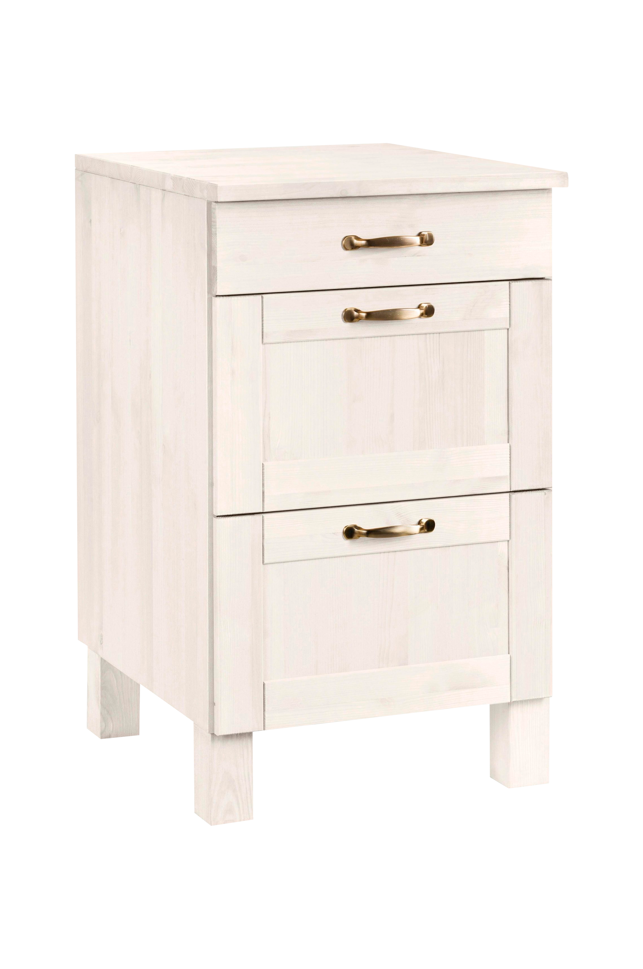 Moderne landkøkken i høj kvalitet: Underskabet imponerer med sit attraktive udseende og praktiske opbevaringsplads. Den øverste skuffe er ideel til bestik og andre køkkenredskaber, mens de to mere rummelige skuffer kan rumme f.eks. service eller mad. Skabet og bordpladen er fremstillet af fsc-certificeret, massivt fyrretræ og fås i forskellige farvekombinationer. De værdifulde metalhåndtag afrunder dette underskabs attraktive design. Møblerne i ˆalby"-serien kan kombineres individuelt, men mister ikke deres dekorative effekt, selv som et enkelt møbel. Underskabet giver en hyggelig landlig flair og sætter hjemlige accenter.