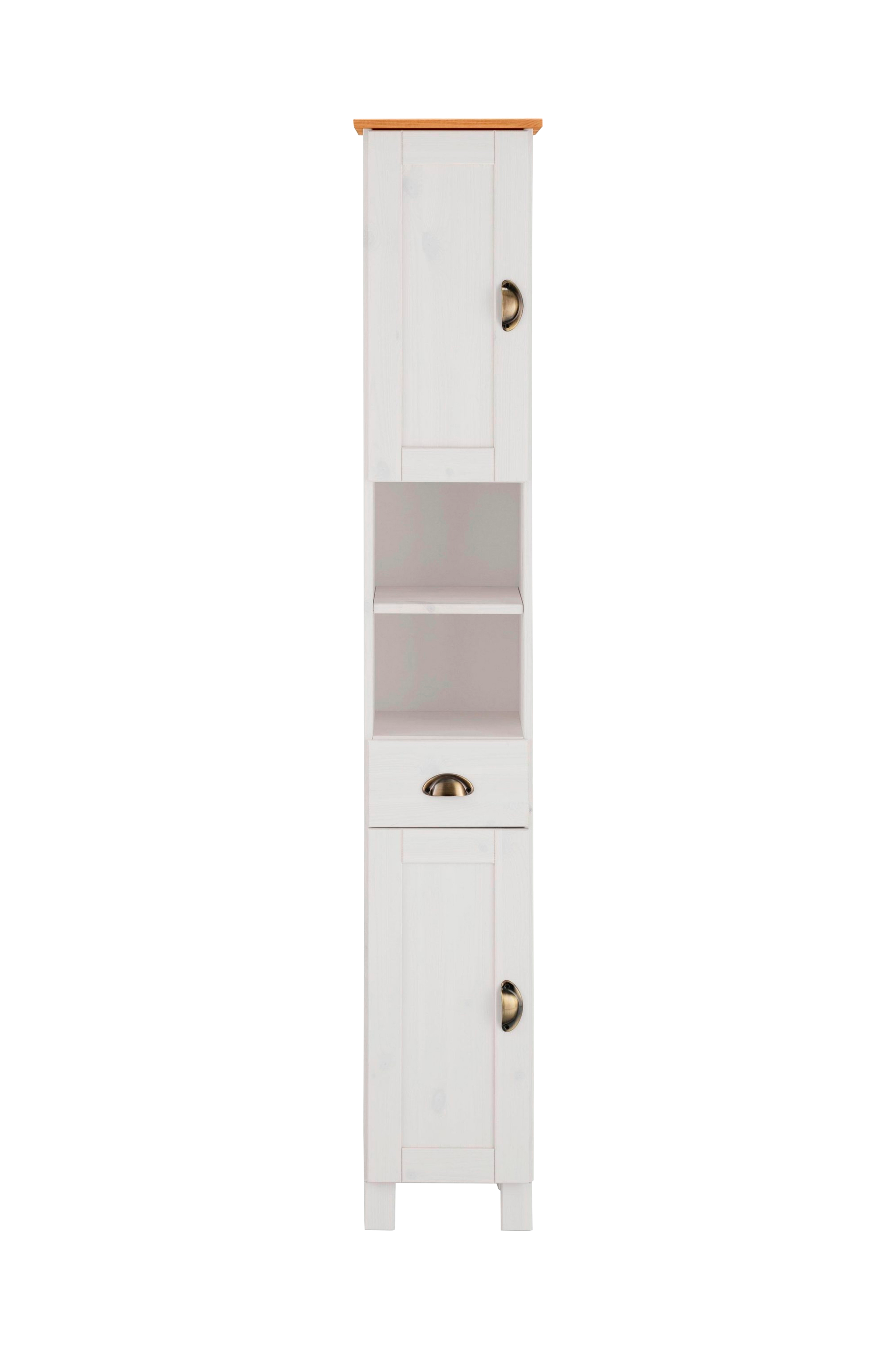 Det rummelige og høje badeværelsesskab er et sandt opbevaringsmirakel. Dette opbevaringsskab præsenterer sig i den tidløse landstil og beriger interiøret med et smagfuldt look. Det samlede billede fuldendes af de muslingeformede håndtag, som passer harmonisk ind i det samlede udseende. Derudover inspirerer dette skab med sin store opbevaringsplads. Det har en skuffe, hvor smådele kan opbevares. Det er også udstyret med åbne rum og to låger. Da det er lavet af fsc-certificeret massivt træ, imponerer det også med sine robuste egenskaber og nemme pleje. Fås i forskellige farver.