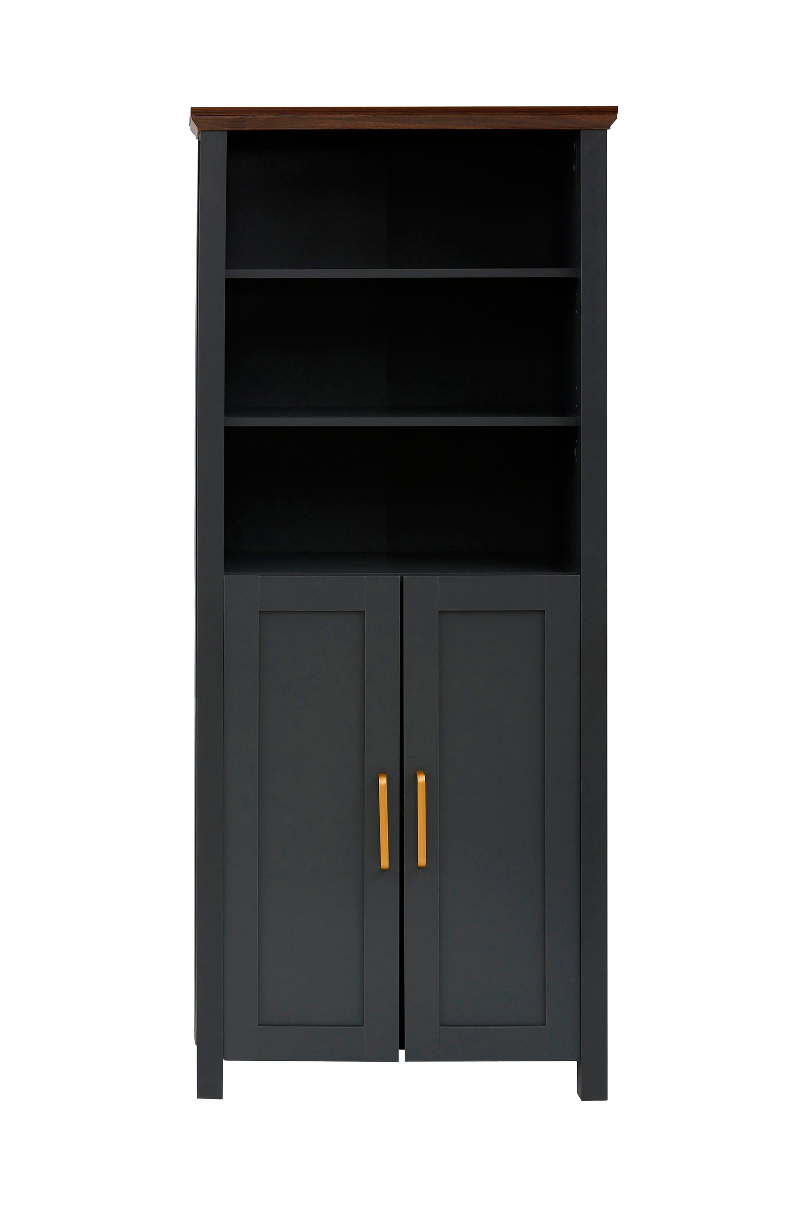 Du kan bringe landlige møbler med moderne charme ind i dit hjem med den vedligeholdelsesvenlige bogreol. Det diskrete farvedesign med en topplade i trælook og guldfarvede metalgreb harmonerer med mange boligstile. Den rummelige reol er især effektiv i tidløse, romantiske eller rustikke interiører. Bag de to låger og i de åbne rum giver reolen dig plads nok til bøger og boligtilbehør. Takket være de rengøringsvenlige overflader kan du holde den ren på ingen tid. Fremstillet af et træbaseret materiale, der er fsc-certificeret: den vedligeholdelsesvenlige boghylde i moderne landlig stil.