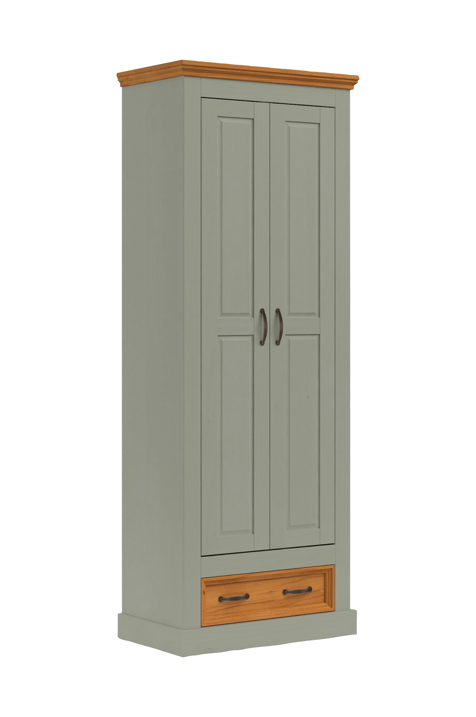 Denne garderobe er lavet af massivt fyrretræ og malet i en stilfuld finish, der giver både karakter og funktionalitet til dit hjem. Den har to døre og en skuffe med en bejdset voksfinish, der giver praktisk opbevaringsplads til tøj og tilbehør. Indvendigt finder du en hylde og en tøjbøjle, der gør det nemt at holde orden. De sorte metalhåndtag tilføjer en moderne kontrast til det naturlige træ. Med sine samlede mål passer denne garderobe godt ind i forskellige rumstørrelser og komplementerer både klassiske og moderne interiører.