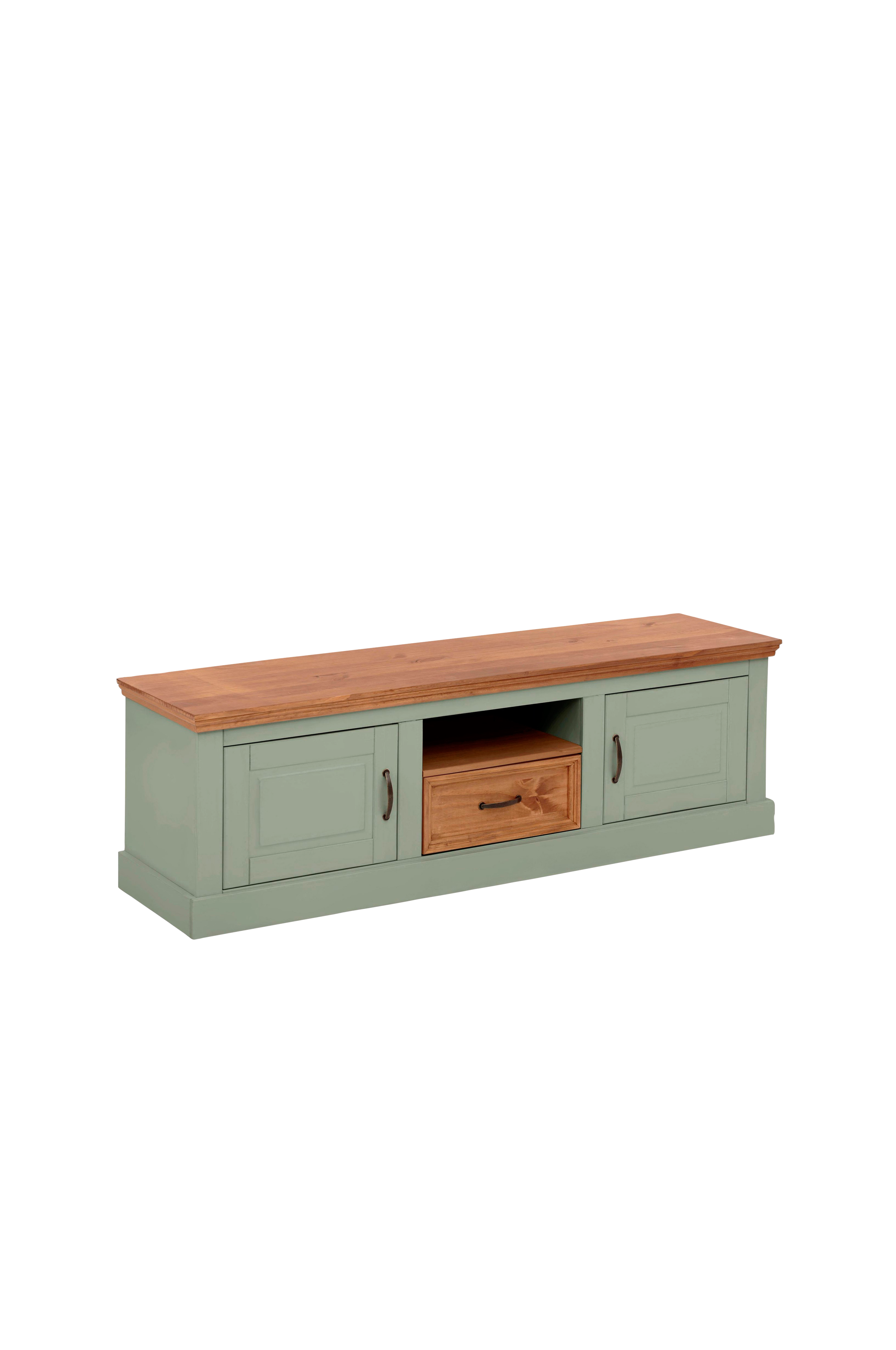 Skænk i massivt træ. Med denne lowboard i massivt træ får du et særligt holdbart møbel. Skufferne kan trækkes helt ud og giver dig ekstra opbevaringsmuligheder. Voksen på overfladen gør træet mindre følsomt over for snavs og fugt. De praktiske buehåndtag i jern er holdbare og understreger stilen. Den maksimale belastningskapacitet er omkring 100 kg.