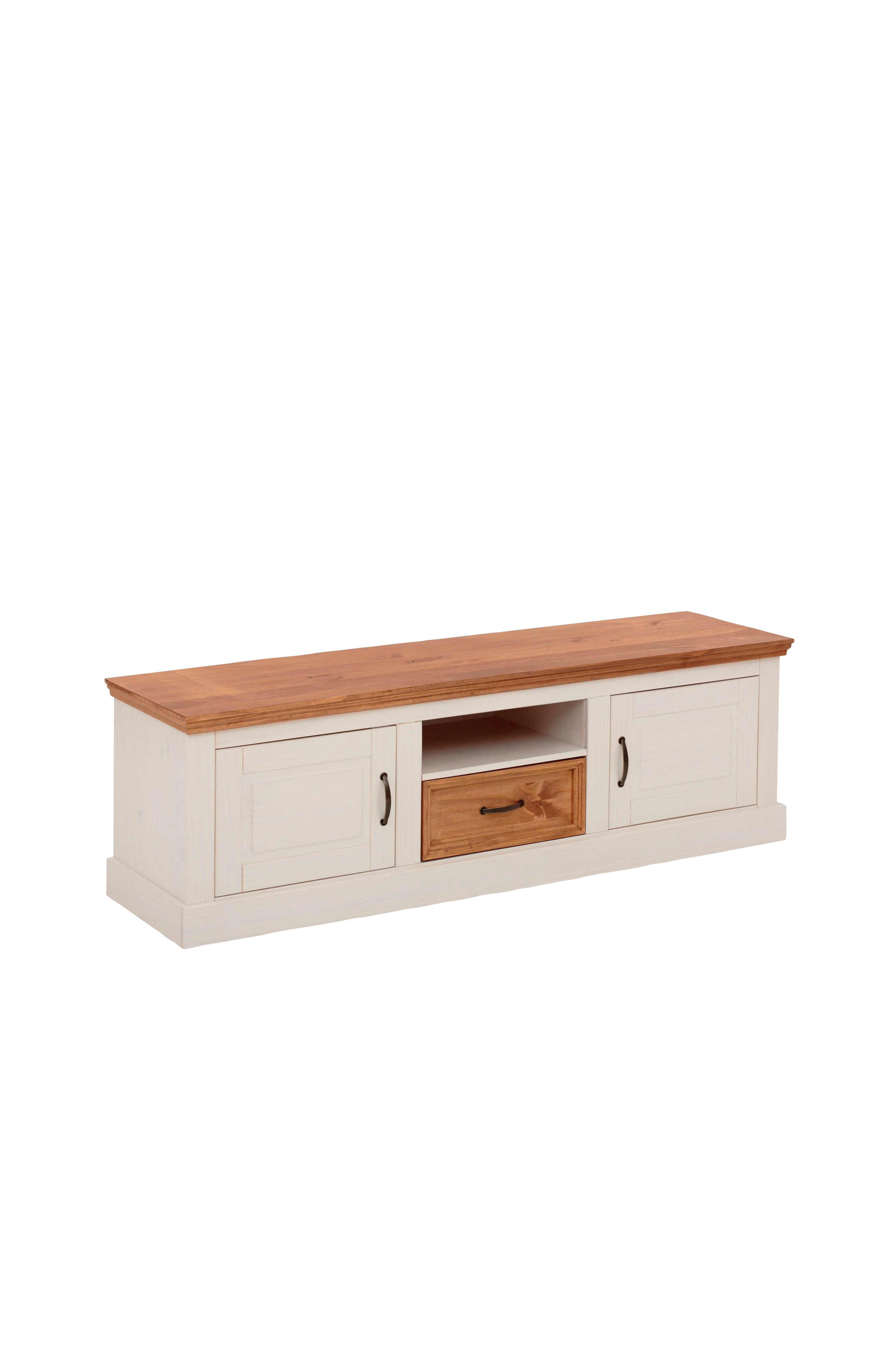 Skænk i massivt træ. Med denne lowboard i massivt træ får du et særligt holdbart møbel. Skufferne kan trækkes helt ud og giver dig ekstra opbevaringsmuligheder. Voksen på overfladen gør træet mindre følsomt over for snavs og fugt. De praktiske buehåndtag i jern er holdbare og understreger stilen. Den maksimale belastningskapacitet er omkring 100 kg.